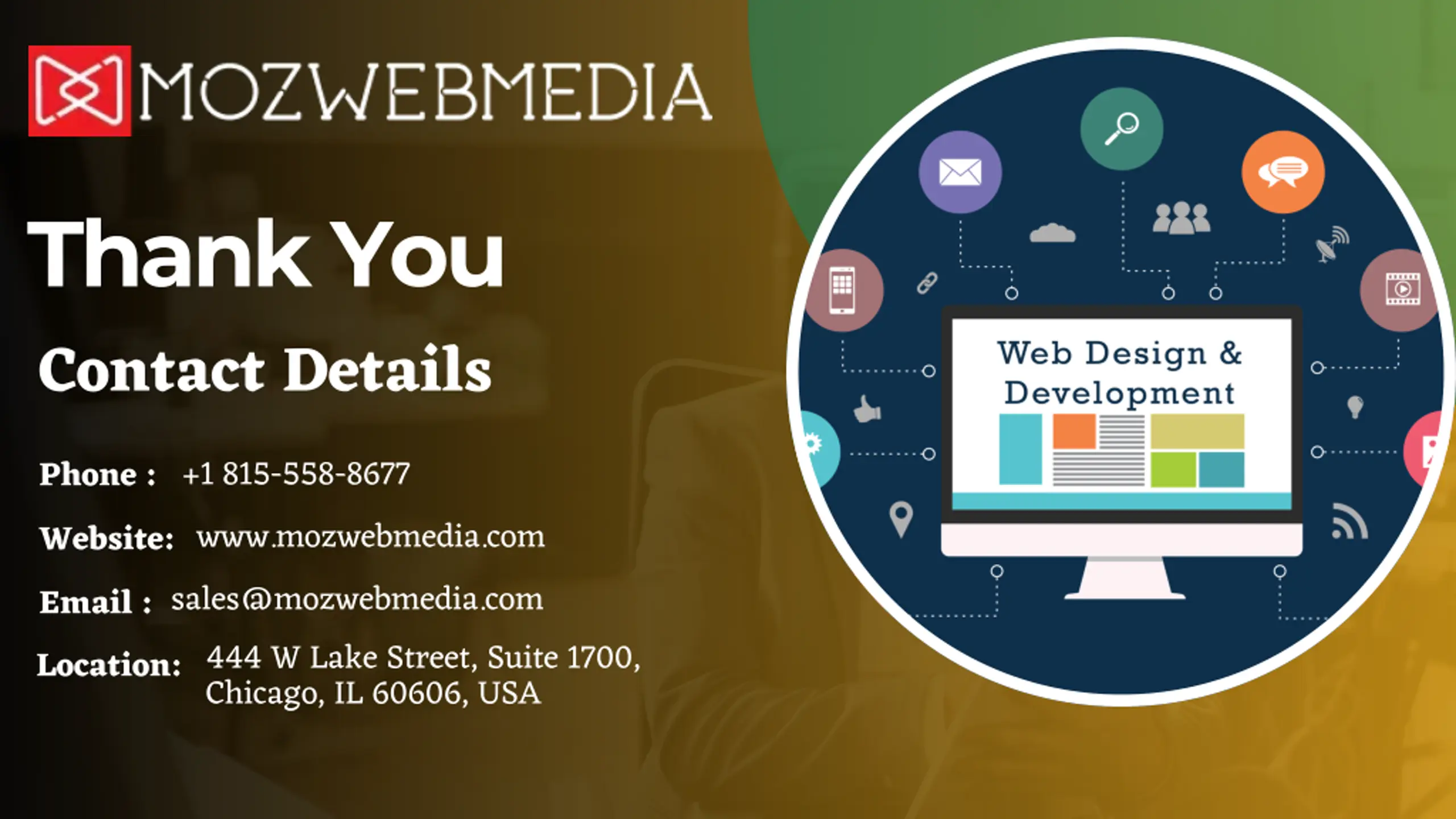 Thank You Contact Details +1 815-558-8677 Phone : Website: www.mozwebmedia.com sales@mozwebmedia.com 444 W Lake Street, Suite 1700, Chicago, IL 60606, USA Email : Location: