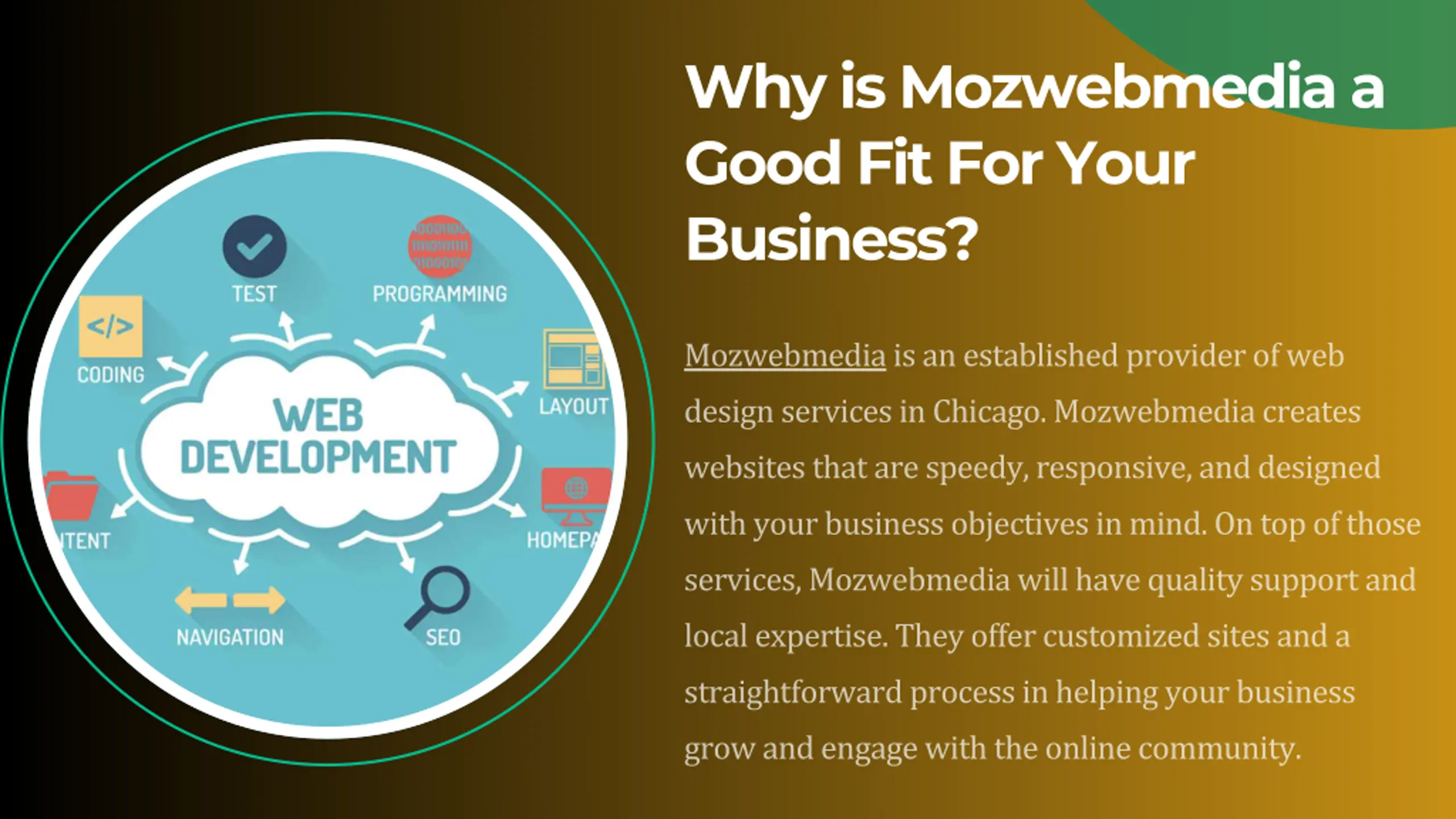 Why is Mozwebmedia a Good Fit For Your Business? Mozwebmedia is an established provider of web design services in Chicago. Mozwebmedia creates websites that are speedy, responsive, and designed with your business objectives in mind. On top of those services, Mozwebmedia will have quality support and local expertise. They offer customized sites and a straightforward process in helping your business grow and engage with the online community.