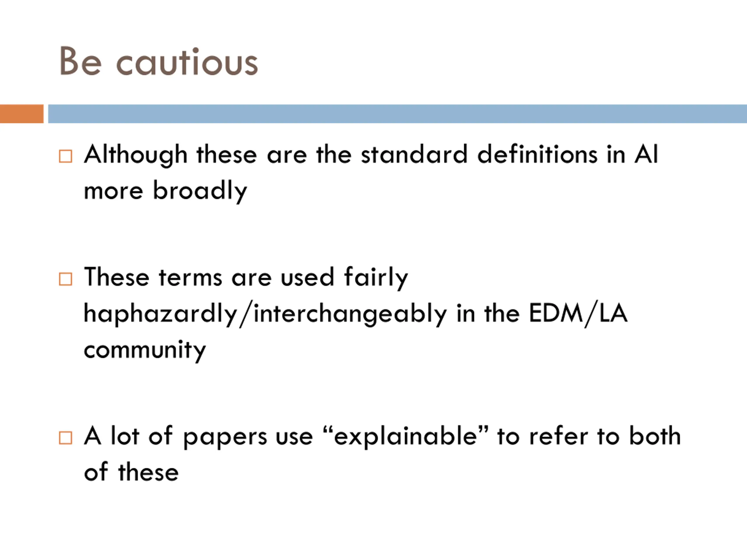 Be cautious Although these are the standard definitions in AI more broadly These terms are used fairly haphazardly/interchangeably in the EDM/LA community A lot of papers use explainable to refer to both of these