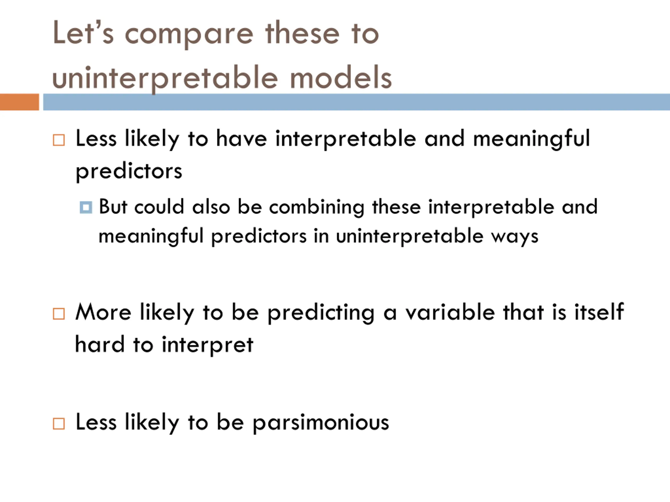 Lets compare these to uninterpretable models Less likely to have interpretable and meaningful predictors But could also be combining these interpretable and meaningful predictors in uninterpretable ways More likely to be predicting a variable that is itself hard to interpret Less likely to be parsimonious