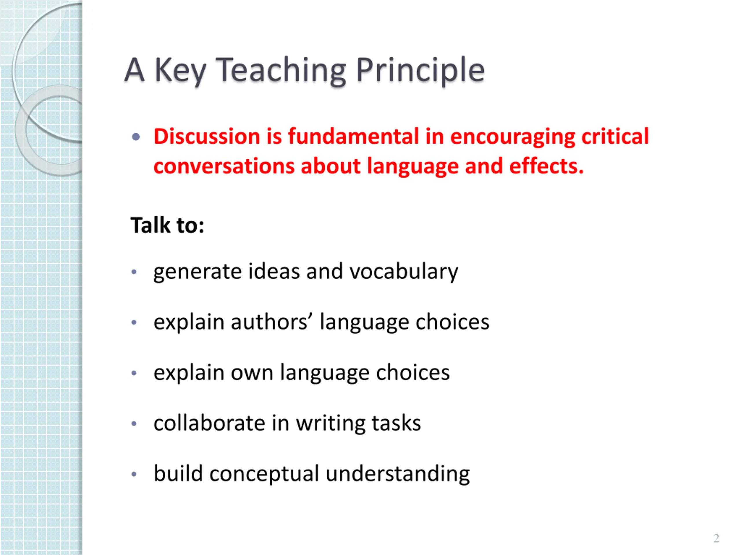 A Key Teaching Principle Discussion is fundamental in encouraging critical conversations about language and effects. Talk to: generate ideas and vocabulary explain authors language choices explain own language choices collaborate in writing tasks build conceptual understanding 2
