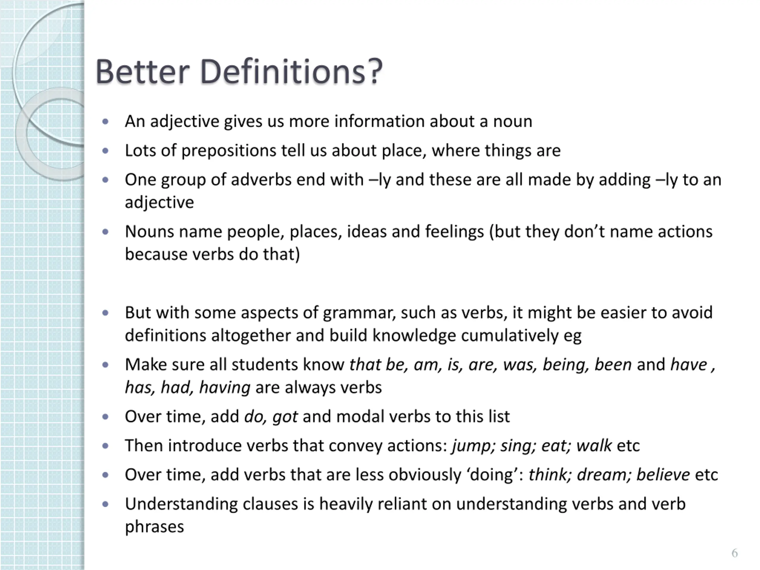 Better Definitions? An adjective gives us more information about a noun Lots of prepositions tell us about place, where things are One group of adverbs end with ly and these are all made by adding ly to an adjective Nouns name people, places, ideas and feelings (but they don t name actions because verbs do that) But with some aspects of grammar, such as verbs, it might be easier to avoid definitions altogether and build knowledge cumulatively eg Make sure all students know that be, am, is, are, was, being, been and have , has, had, having are always verbs Over time, add do, got and modal verbs to this list Then introduce verbs that convey actions: jump; sing; eat; walk etc Over time, add verbs that are less obviously doing : think; dream; believe etc Understanding clauses is heavily reliant on understanding verbs and verb phrases 6