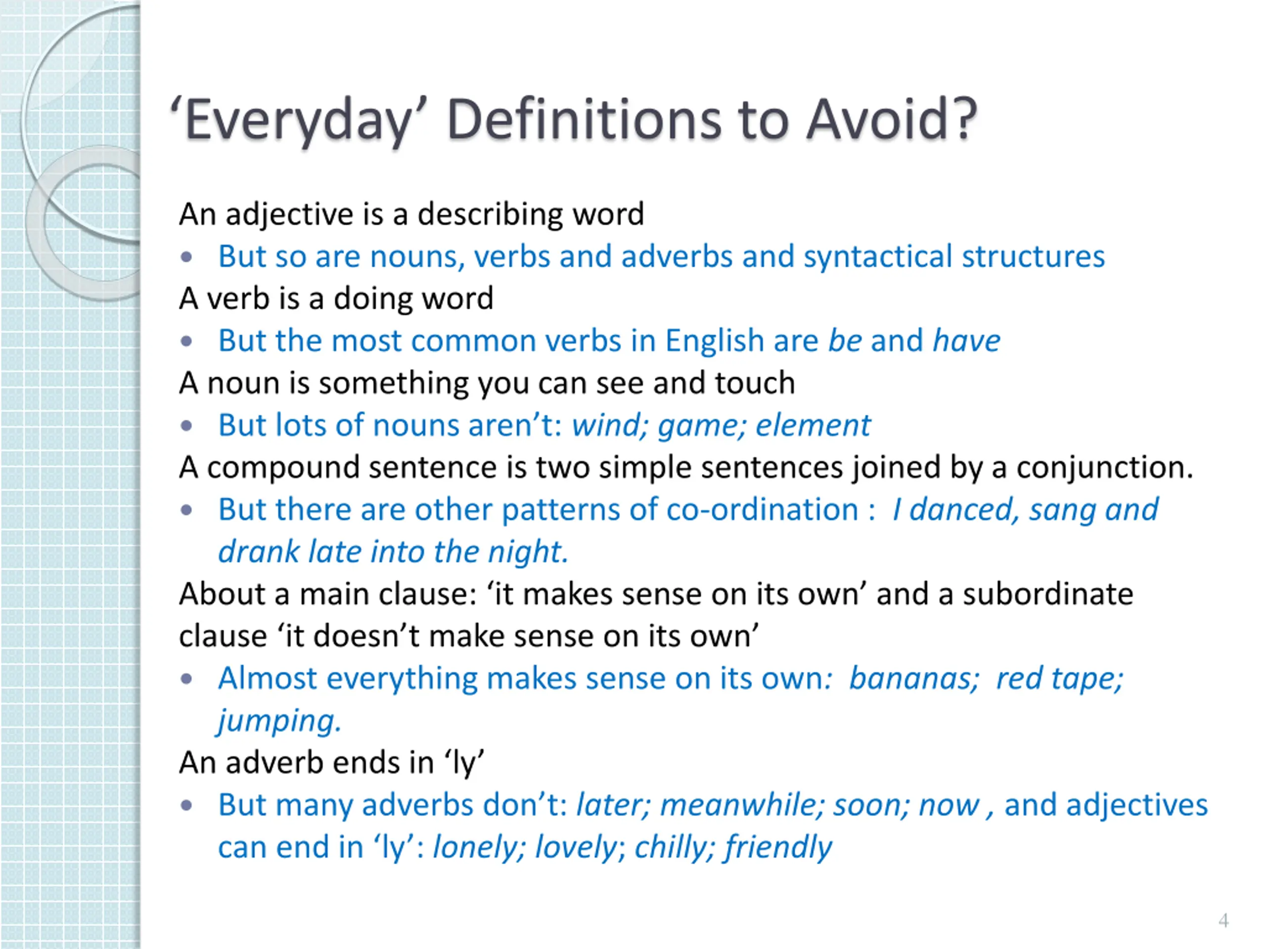 Everyday Definitions to Avoid? An adjective is a describing word But so are nouns, verbs and adverbs and syntactical structures A verb is a doing word But the most common verbs in English are be and have A noun is something you can see and touch But lots of nouns aren t: wind; game; element A compound sentence is two simple sentences joined by a conjunction. But there are other patterns of co-ordination : I danced, sang and drank late into the night. About a main clause: it makes sense on its own and a subordinate clause it doesn t make sense on its own Almost everything makes sense on its own: bananas; red tape; jumping. An adverb ends in ly But many adverbs don t: later; meanwhile; soon; now , and adjectives can end in ly : lonely; lovely; chilly; friendly 4