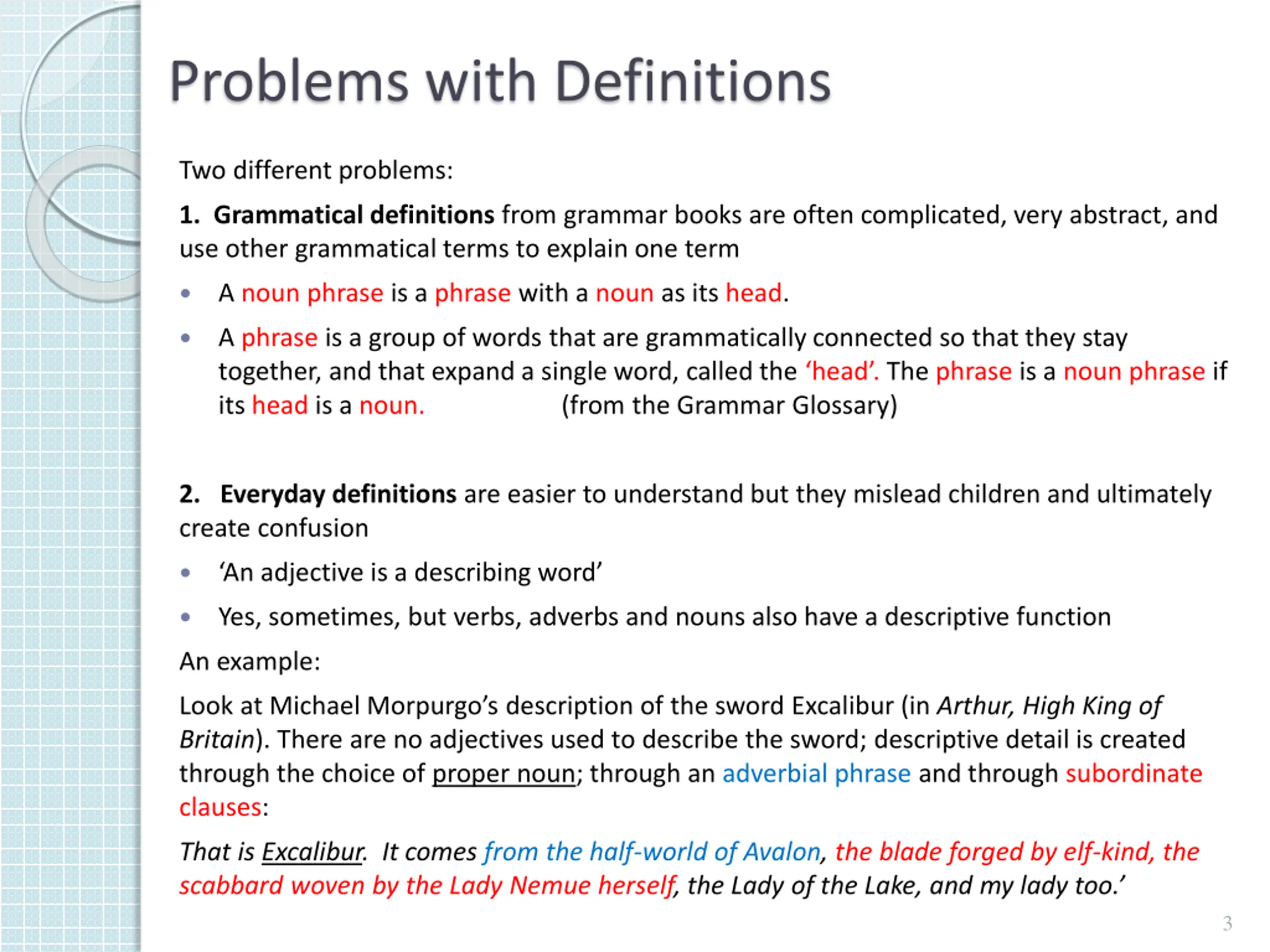 Problems with Definitions Two different problems: 1. Grammatical definitions from grammar books are often complicated, very abstract, and use other grammatical terms to explain one term A noun phrase is a phrase with a noun as its head. A phrase is a group of words that are grammatically connected so that they stay together, and that expand a single word, called the head . The phrase is a noun phrase if its head is a noun. (from the Grammar Glossary) 2. Everyday definitions are easier to understand but they mislead children and ultimately create confusion An adjective is a describing word Yes, sometimes, but verbs, adverbs and nouns also have a descriptive function An example: Look at Michael Morpurgo s description of the sword Excalibur (in Arthur, High King of Britain). There are no adjectives used to describe the sword; descriptive detail is created through the choice of proper noun; through an adverbial phrase and through subordinate clauses: That is Excalibur. It comes from the half-world of Avalon, the blade forged by elf-kind, the scabbard woven by the Lady Nemue herself, the Lady of the Lake, and my lady too. 3