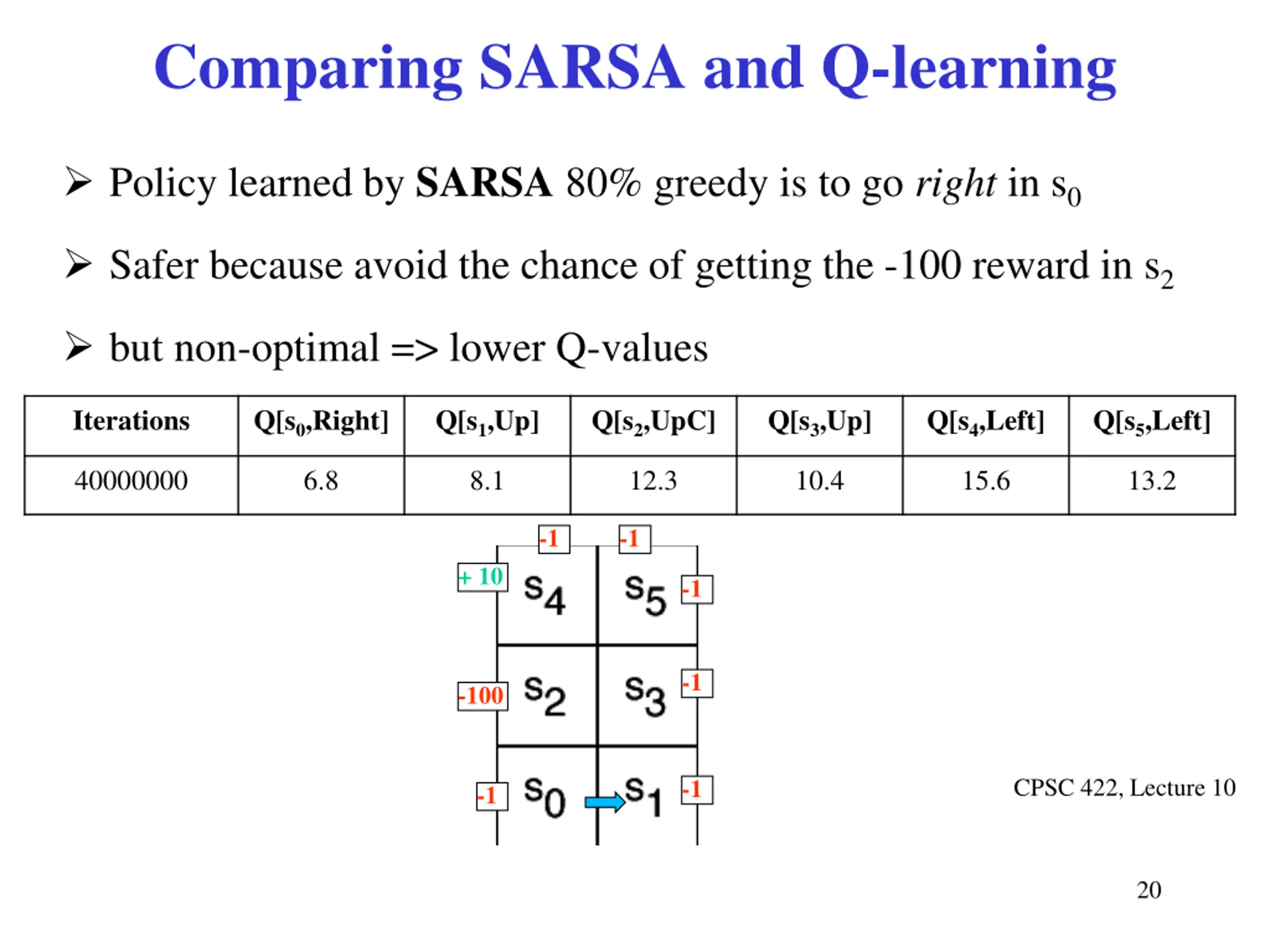 Comparing SARSA and Q-learning Policy learned by SARSA 80% greedy is to go right in s0 Safer because avoid the chance of getting the -100 reward in s2 but non-optimal => lower Q-values Iterations Q[s0,Right] Q[s1,Up] Q[s2,UpC] Q[s3,Up] Q[s4,Left] Q[s5,Left] 40000000 6.8 8.1 12.3 10.4 15.6 13.2 -1 -1 + 10 -1 -1 -100 CPSC 422, Lecture 10 -1 -1 20