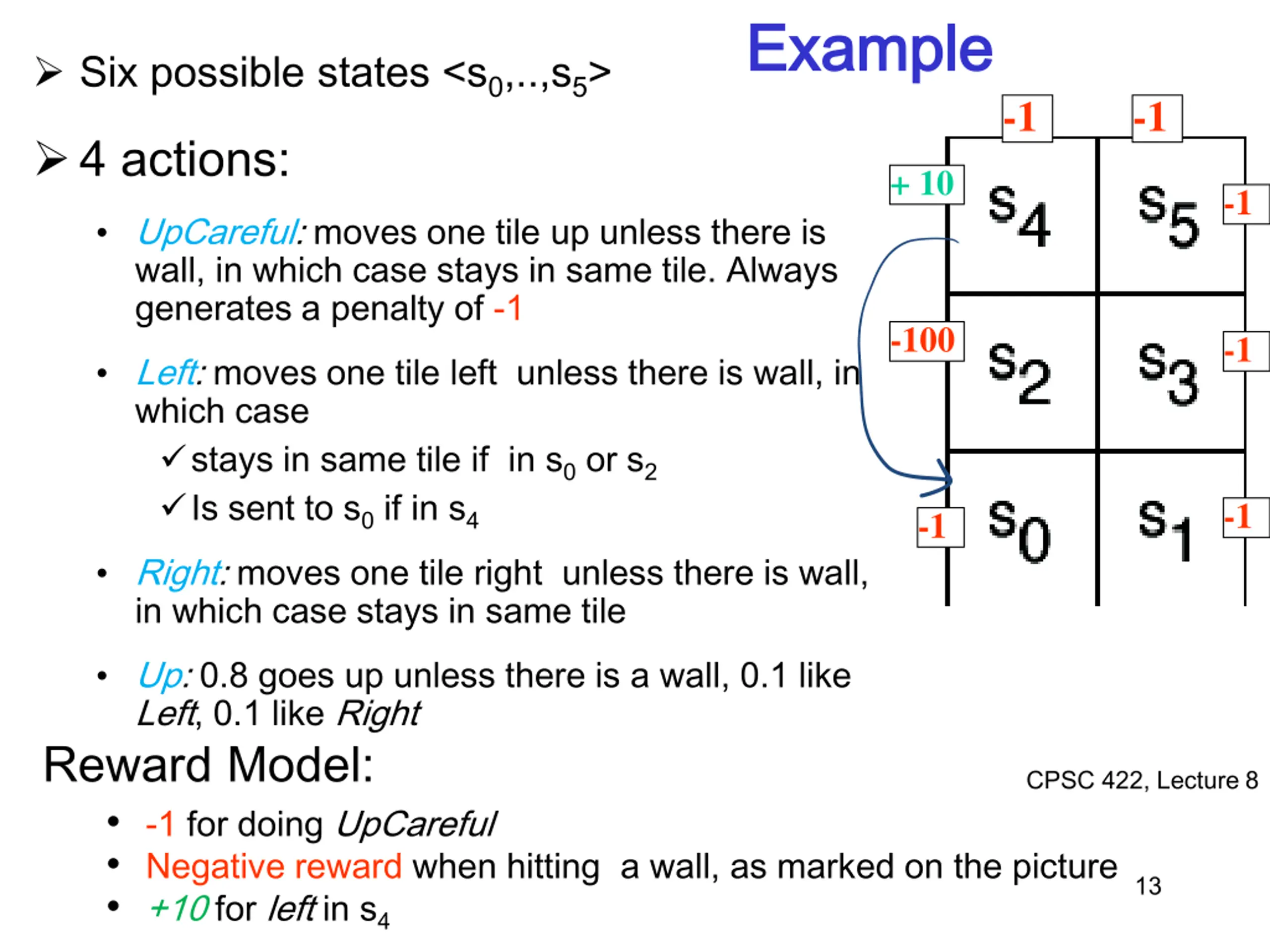 Example Example Six possible states <s0,..,s5> 4 actions: UpCareful: moves one tile up unless there is wall, in which case stays in same tile. Always generates a penalty of -1 Left: moves one tile left unless there is wall, in which case stays in same tile if in s0 or s2 Is sent to s0 if in s4 Right: moves one tile right unless there is wall, in which case stays in same tile Up: 0.8 goes up unless there is a wall, 0.1 like Left, 0.1 like Right -1 -1 + 10 -1 -100 -1 -1 -1 Reward Model: -1 for doing UpCareful Negative reward when hitting a wall, as marked on the picture +10 for left in s4 CPSC 422, Lecture 8 13
