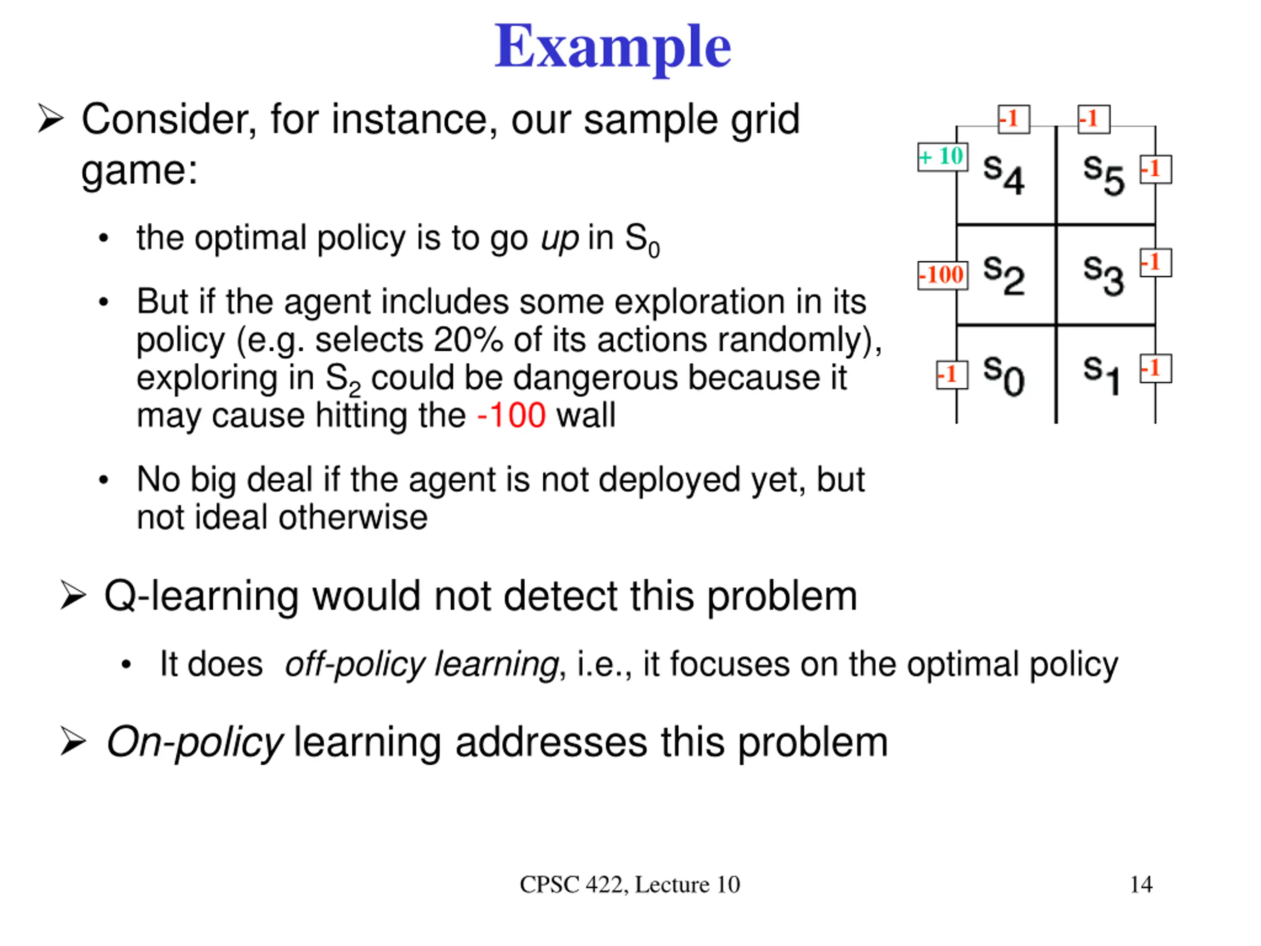 Example Consider, for instance, our sample grid game: -1 -1 + 10 -1 the optimal policy is to go up in S0 But if the agent includes some exploration in its policy (e.g. selects 20% of its actions randomly), exploring in S2 could be dangerous because it may cause hitting the -100 wall -1 -100 -1 -1 No big deal if the agent is not deployed yet, but not ideal otherwise Q-learning would not detect this problem It does off-policy learning, i.e., it focuses on the optimal policy On-policy learning addresses this problem CPSC 422, Lecture 10 14