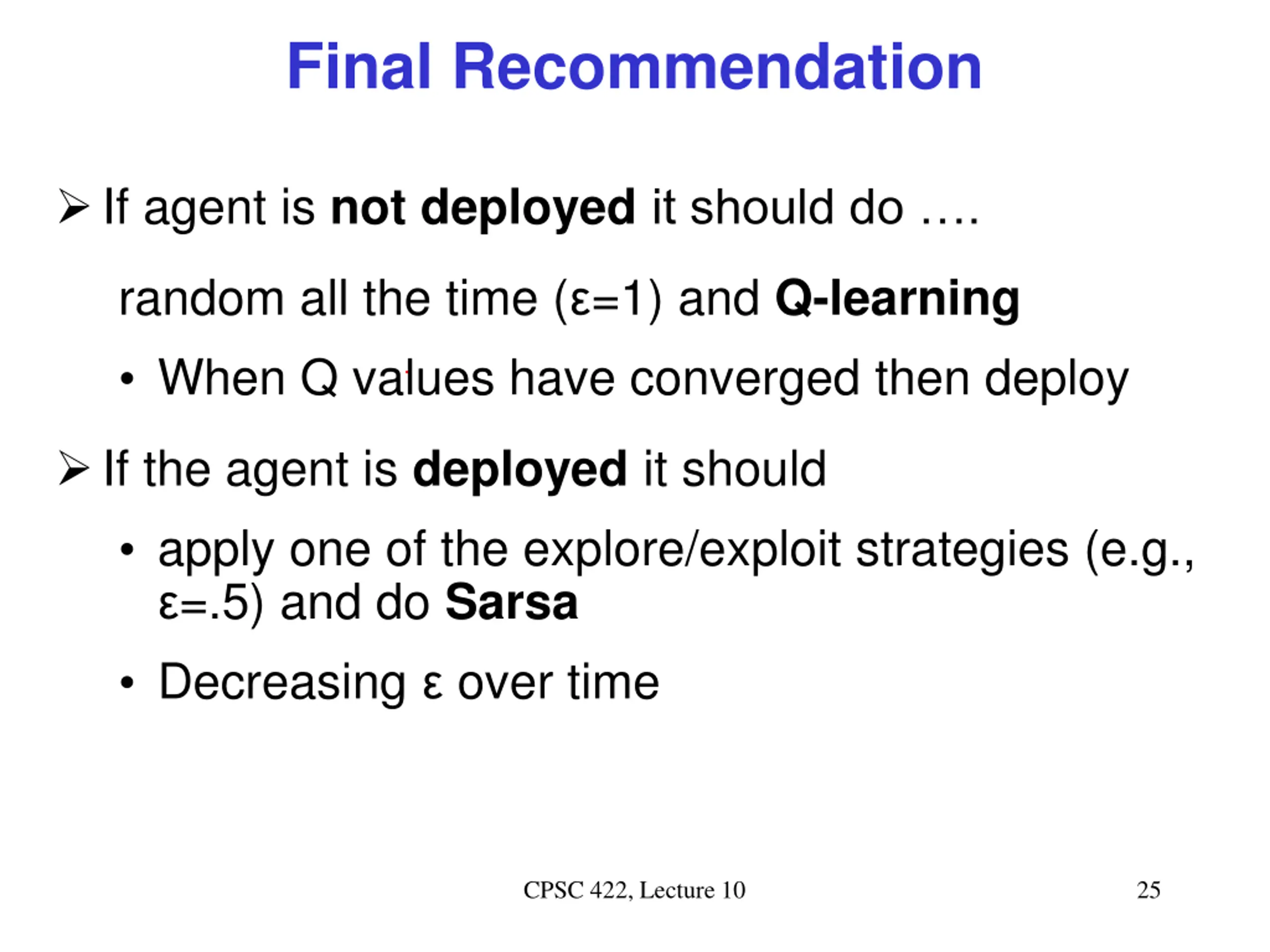 Final Recommendation If agent is not deployedit should do . random all the time ( =1) and Q-learning When Q values have converged then deploy If the agent is deployed it should apply one of the explore/exploit strategies (e.g., =.5) and do Sarsa Decreasing over time CPSC 422, Lecture 10 25