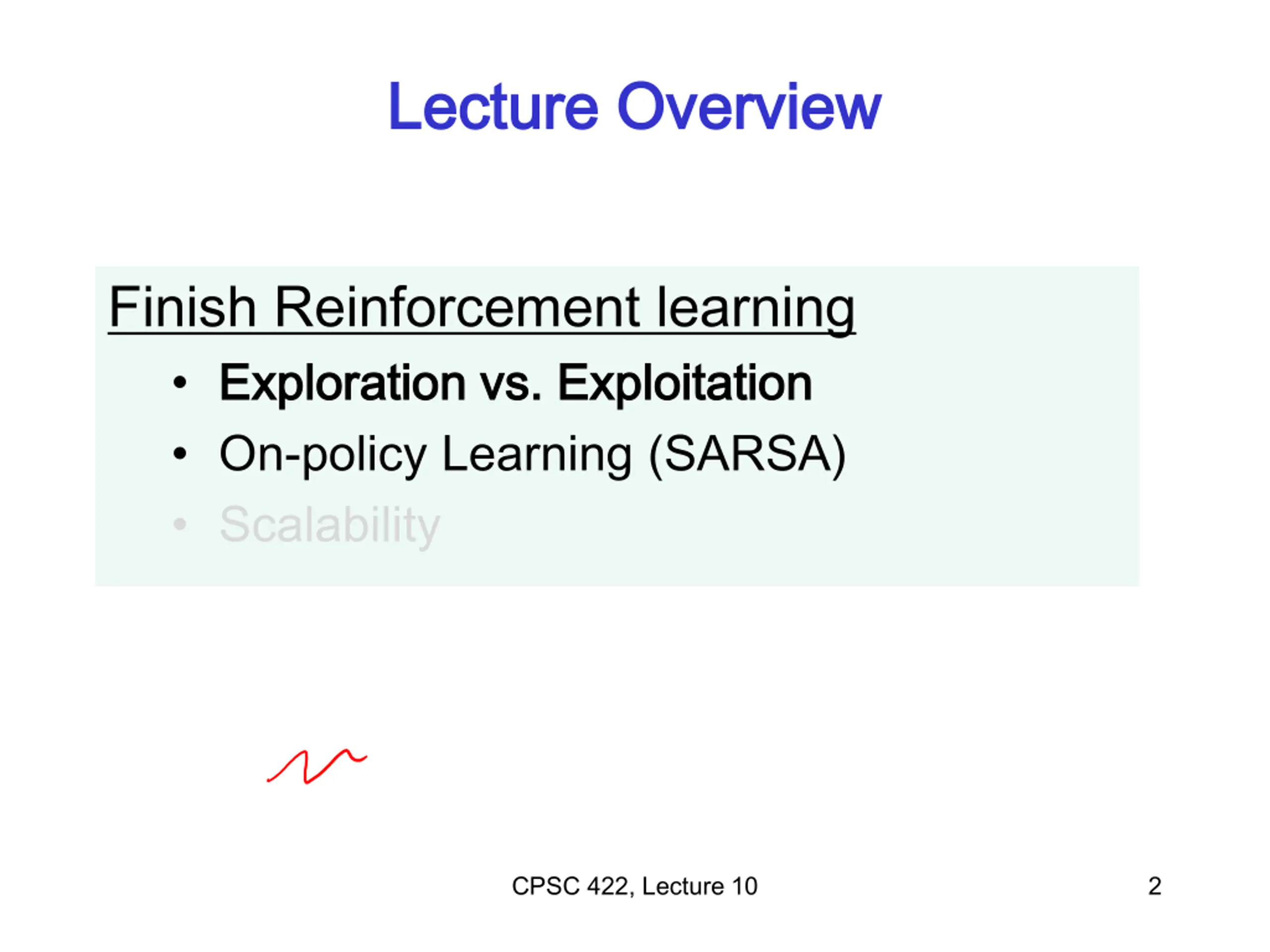 Lecture Overview Lecture Overview Finish Reinforcement learning Exploration vs. Exploitation Exploration vs. Exploitation On-policy Learning (SARSA) Scalability CPSC 422, Lecture 10 2