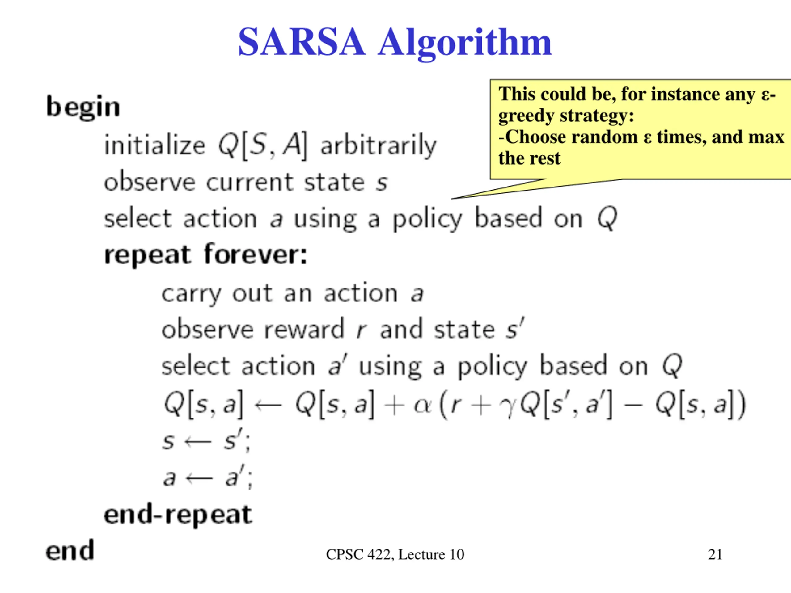 SARSA Algorithm This could be, for instance any - greedy strategy: -Choose random times, and max the rest CPSC 422, Lecture 10 21