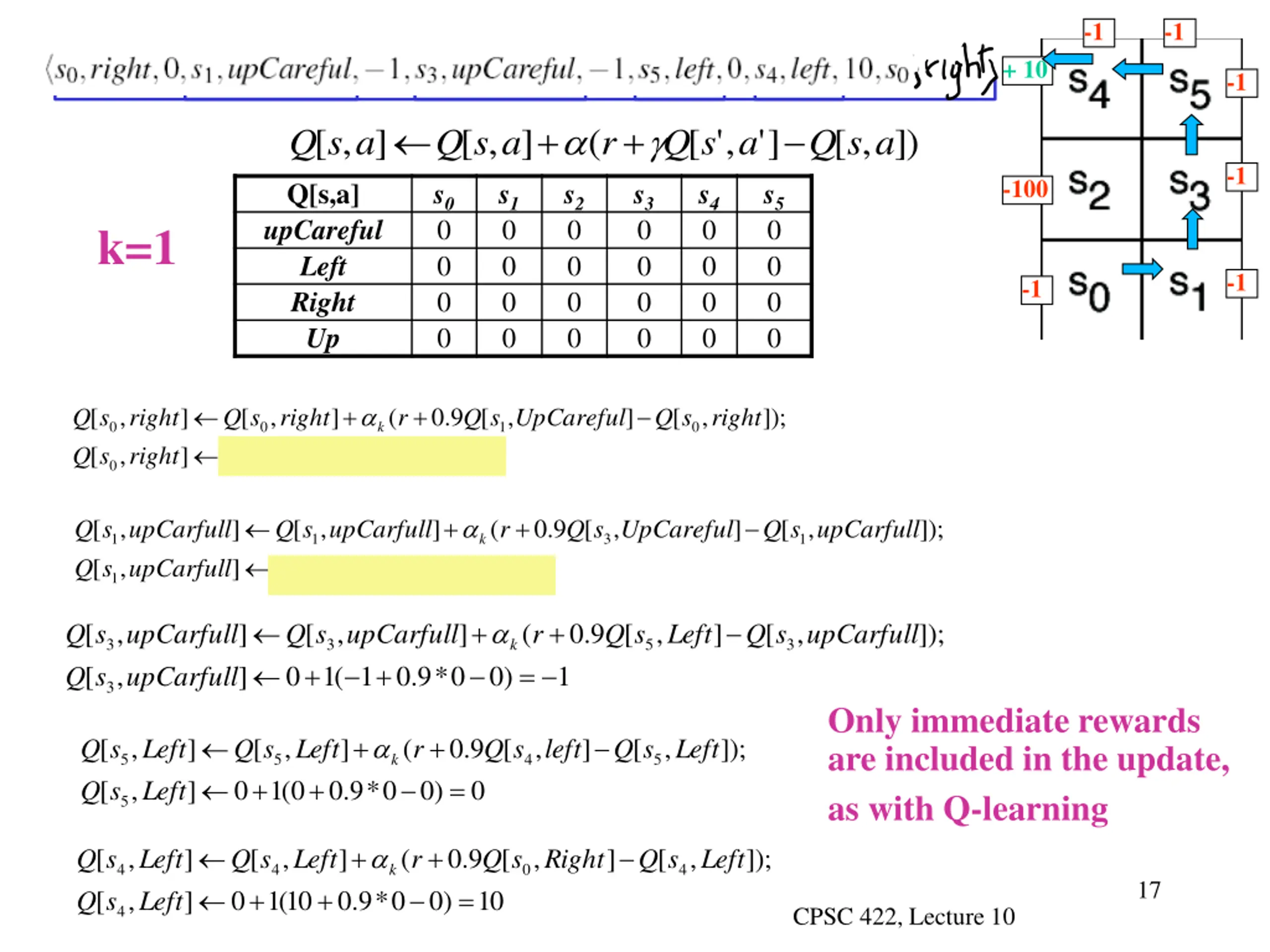 -1 -1 + 10 -1 + + [ , ] [ , ] ( [ , ' s ] ' a [ , ]) Q s a Q s a r Q Q s a -1 -100 s0 0 0 0 0 s1 0 0 0 0 s2 0 0 0 0 s3 0 0 0 0 s4 0 0 0 0 s5 0 0 0 0 Q[s,a] upCareful Left Right Up k=1 k=1 -1 -1 + + [ , ] [ , ] ( 9 . 0 = [ , ] [ , ]); Q s right Q s right r Q s UpCareful Q s right 0 0 1 0 k 0 ( 1 + 9 . 0 + ) 0 [ , ] 0 * 0 0 Q s right 0 + 9 . 0 + [ , ] [ , ] ( = [ , ] [ , ]); Q s upCarfull Q s upCarfull r Q s UpCareful Q s upCarfull 1 1 3 1 k ( 1 + 9 . 0 + ) 0 [ , ] 0 1 * 0 1 Q s upCarfull 1 + 9 . 0 + [ , ] [ , ] ( = [ , ] [ , ]); Q s upCarfull Q s upCarfull r Q s Left Q s upCarfull 3 3 5 3 k ( 1 + 9 . 0 + ) 0 [ , ] 0 1 * 0 1 Q s upCarfull 3 Only immediate rewards are included in the update, as with Q-learning + + [ , ] [ , ] ( 9 . 0 = [ , ] [ , ]); Q s Left Q s Left r Q s left Q s Left 5 5 4 5 k 0 ( 1 + 9 . 0 + ) 0 [ , ] 0 * 0 0 Q s Left 5 + + [ , ] [ , ] ( 9 . 0 = [ , ] [ , ]); Q s Left Q s Left r Q s Right Q s Left 4 4 0 4 k 17 ( 1 + 9 . 0 + ) 0 [ , ] 0 10 * 0 10 Q s Left CPSC 422, Lecture 10 4