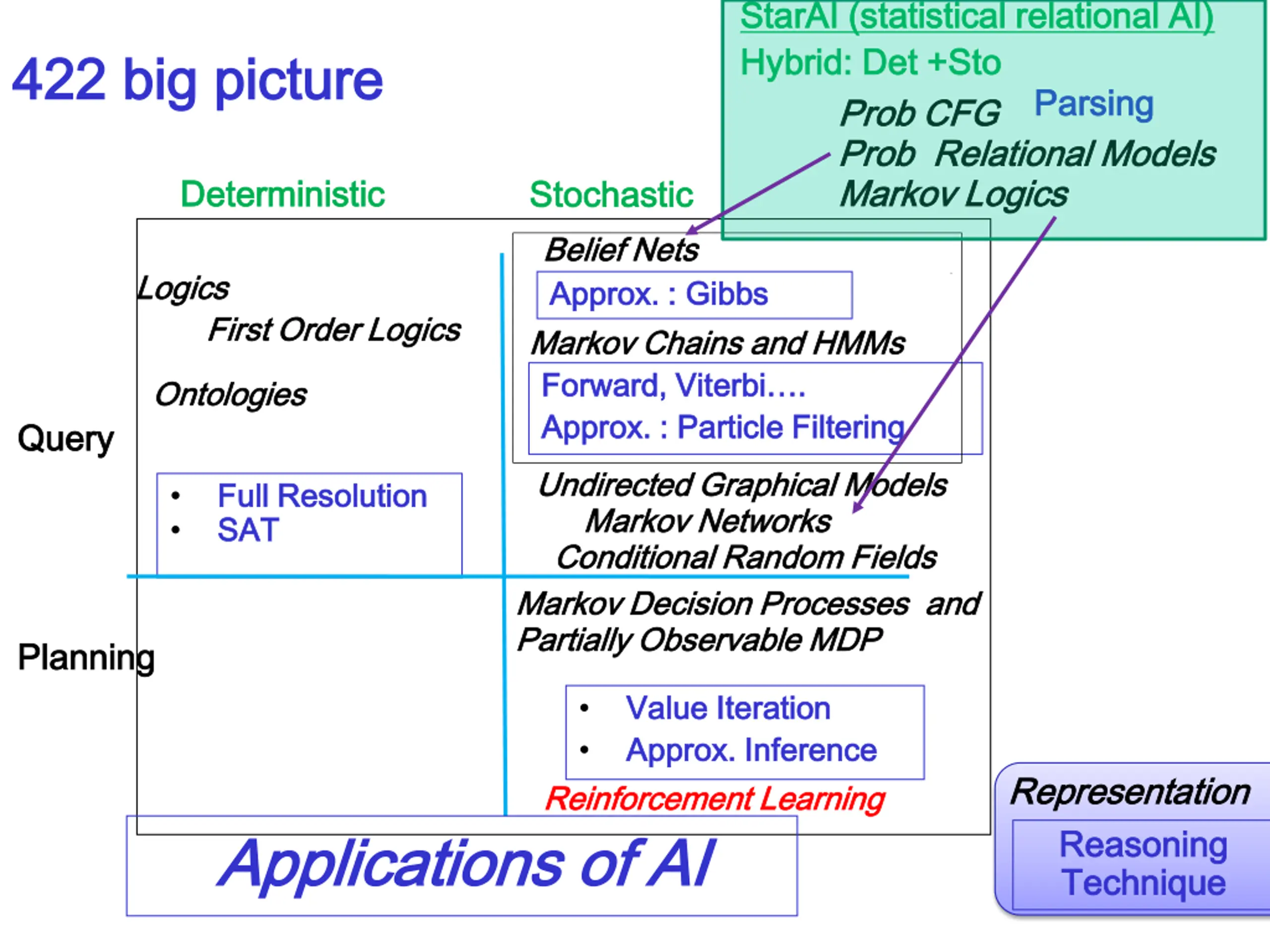 StarAI StarAI (statistical relational AI) (statistical relational AI) Hybrid: Hybrid: Det Det + +Sto Sto 422 big picture 422 big picture Parsing Parsing Prob Prob CFG CFG Prob Prob Relational Models Relational Models Markov Logics Markov Logics Deterministic Deterministic Stochastic Stochastic Belief Nets Belief Nets Approx. : Gibbs Approx. : Gibbs Logics Logics First Order Logics First Order Logics Markov Chains and HMMs Markov Chains and HMMs Forward, Viterbi . Forward, Viterbi . Approx. : Particle Filtering Approx. : Particle Filtering Ontologies Ontologies Query Query Undirected Graphical Models Undirected Graphical Models Markov Networks Markov Networks Conditional Random Fields Conditional Random Fields Full Resolution Full Resolution SAT SAT Markov Decision Processes and Markov Decision Processes and Partially Observable MDP Partially Observable MDP Planning Planning Value Iteration Value Iteration Approx. Inference Approx. Inference Reinforcement Learning Reinforcement Learning Representation Representation Reasoning Reasoning Technique Technique Applications of AI Applications of AI CPSC 422, Lecture 35 Slide 28