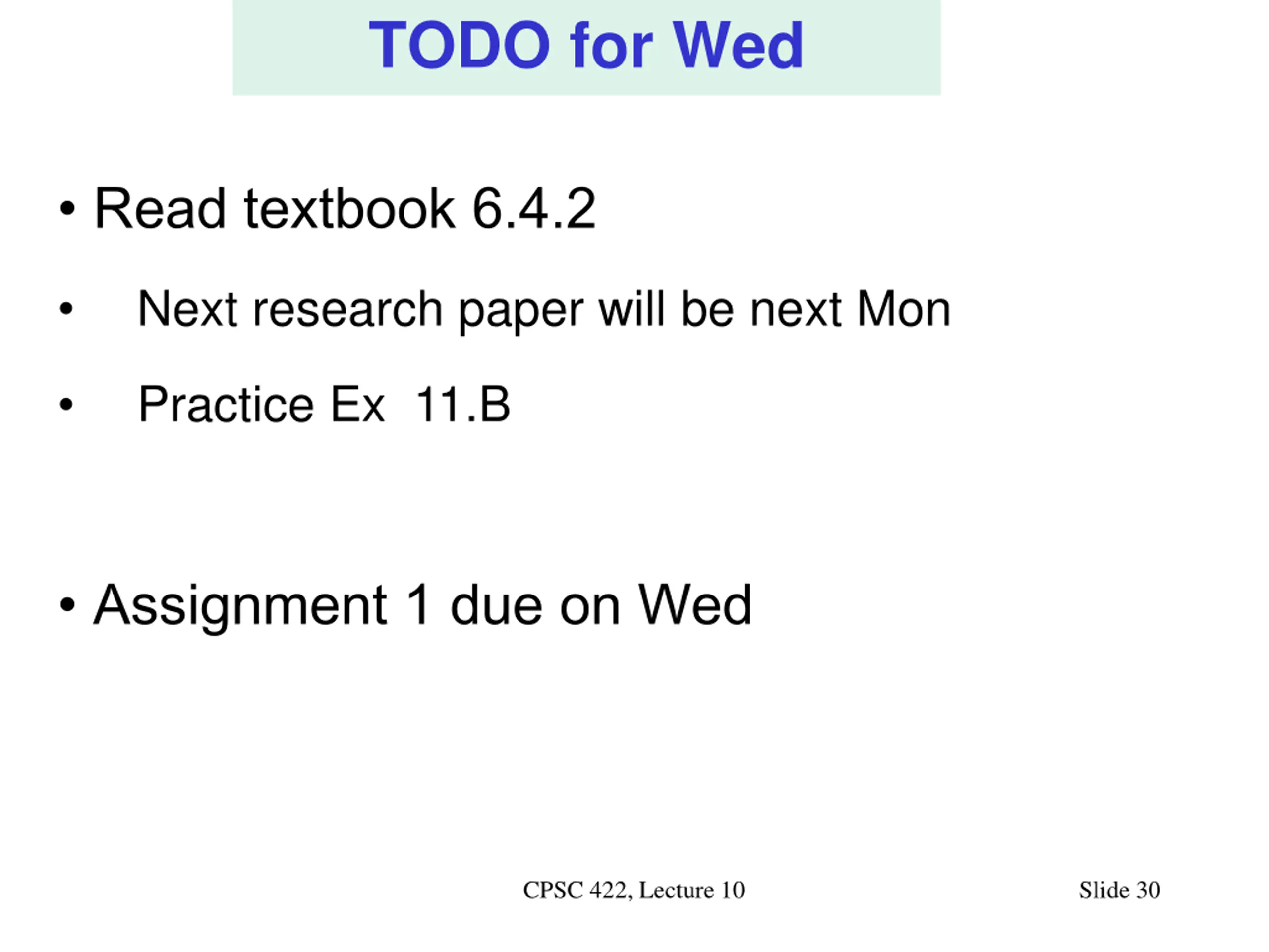 TODO for Wed Read textbook 6.4.2 Next research paper will be next Mon Practice Ex 11.B Assignment 1 due on Wed CPSC 422, Lecture 10 Slide 30