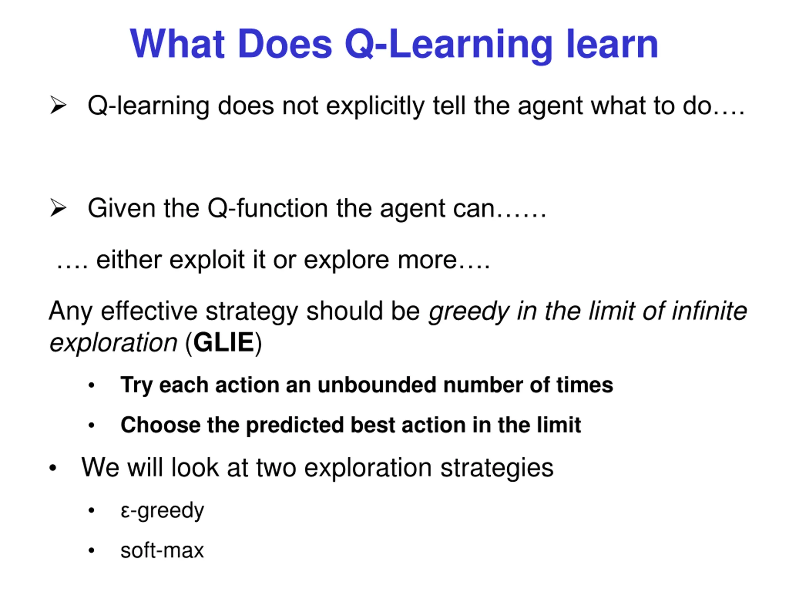 What Does Q-Learning learn Q-learning does not explicitly tell the agent what to do . Given the Q-function the agent can . either exploit it or explore more . Any effective strategy should be greedy in the limit of infinite exploration (GLIE) Try each action an unbounded number of times Choose the predicted best action in the limit We will look at two exploration strategies -greedy soft-max CPSC 422, Lecture 10 7