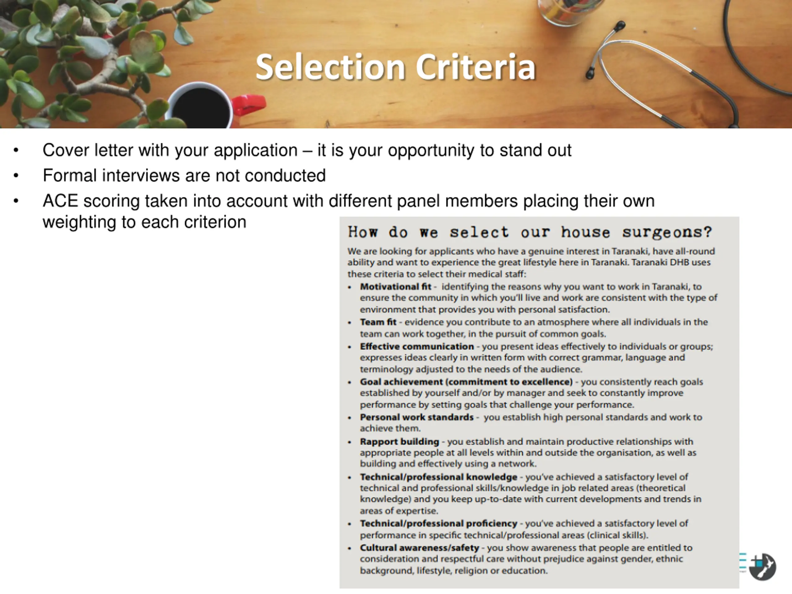 Selection Criteria Cover letter with your application it is your opportunity to stand out Formal interviews are not conducted ACE scoring taken into account with different panel members placing their own weighting to each criterion