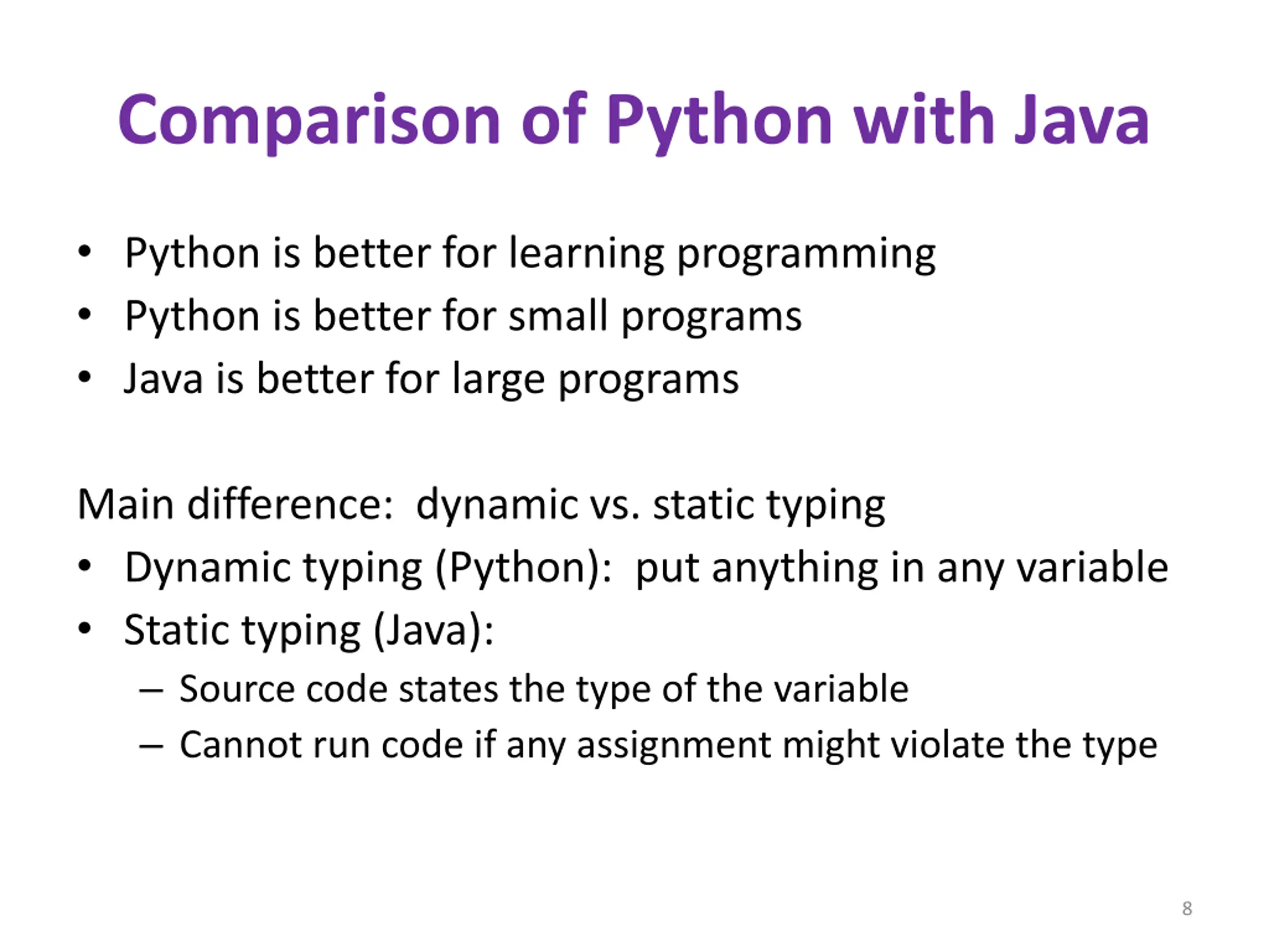 Comparison of Python with Java Python is better for learning programming Python is better for small programs Java is better for large programs Main difference: dynamic vs. static typing Dynamic typing (Python): put anything in any variable Static typing (Java): Source code states the type of the variable Cannot run code if any assignment might violate the type 8