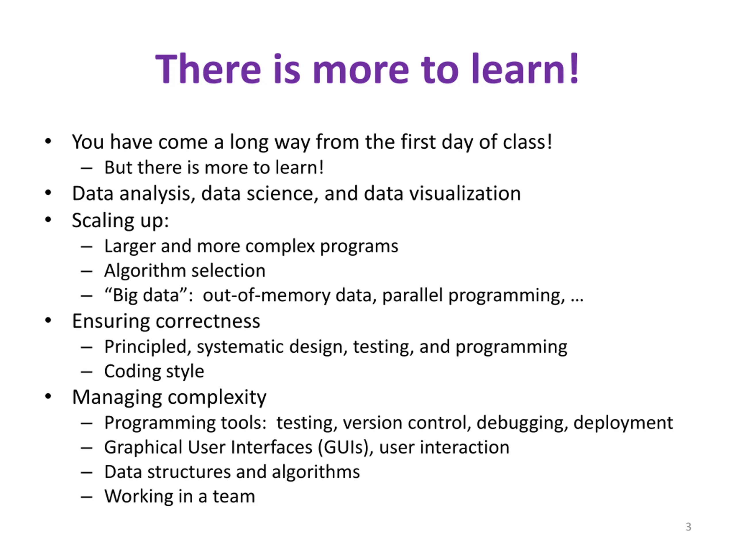 There is more to learn! You have come a long way from the first day of class! But there is more to learn! Data analysis, data science, and data visualization Scaling up: Larger and more complex programs Algorithm selection Big data : out-of-memory data, parallel programming, Ensuring correctness Principled, systematic design, testing, and programming Coding style Managing complexity Programming tools: testing, version control, debugging, deployment Graphical User Interfaces (GUIs), user interaction Data structures and algorithms Working in a team 3