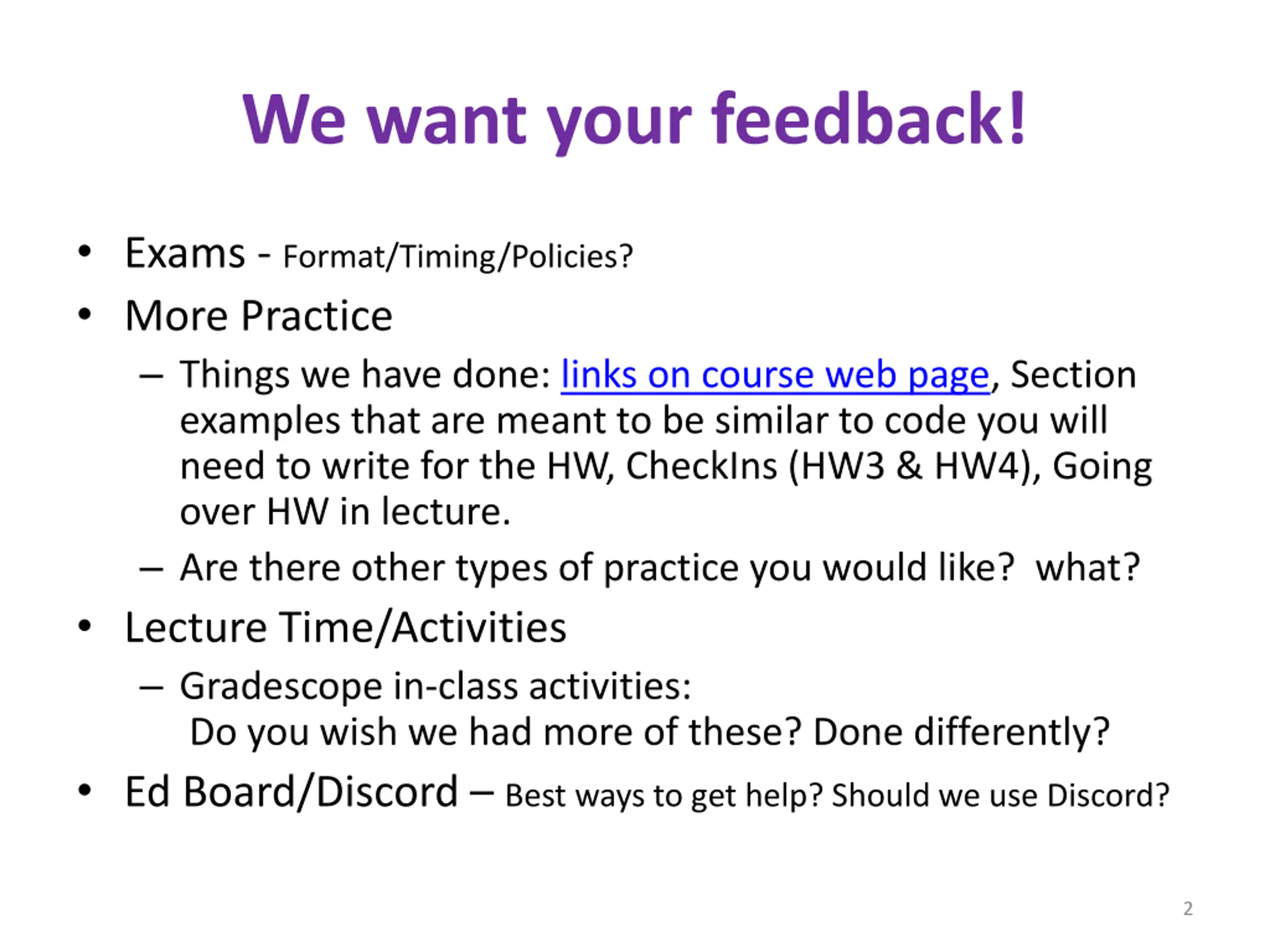 We want your feedback! Exams - Format/Timing/Policies? More Practice Things we have done: links on course web page, Section examples that are meant to be similar to code you will need to write for the HW, CheckIns (HW3 & HW4), Going over HW in lecture. Are there other types of practice you would like? what? Lecture Time/Activities Gradescope in-class activities: Do you wish we had more of these? Done differently? Ed Board/Discord Best ways to get help? Should we use Discord? 2