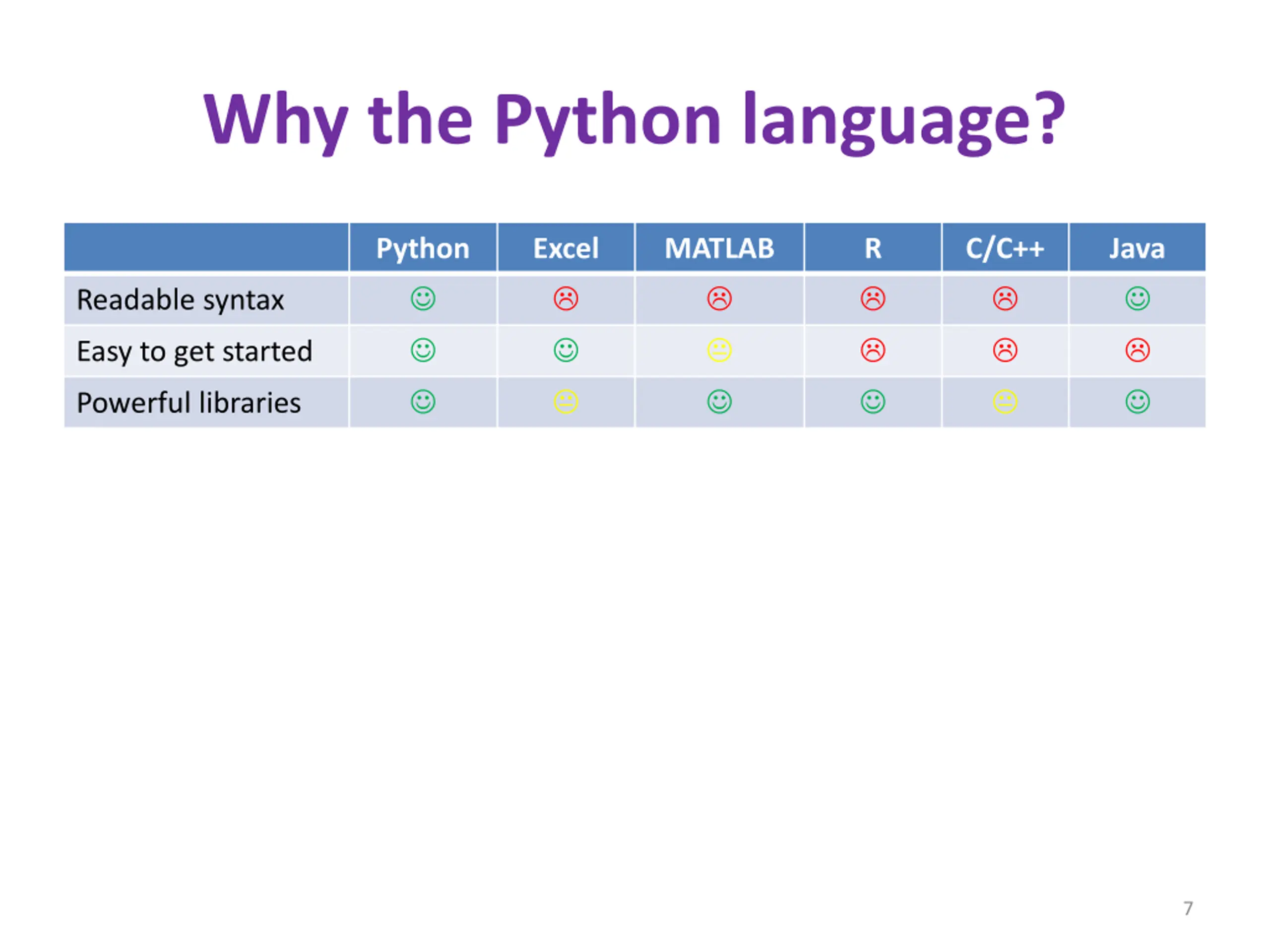 Why the Python language? Python Excel MATLAB R C/C++ Java Readable syntax Easy to get started Powerful libraries 7