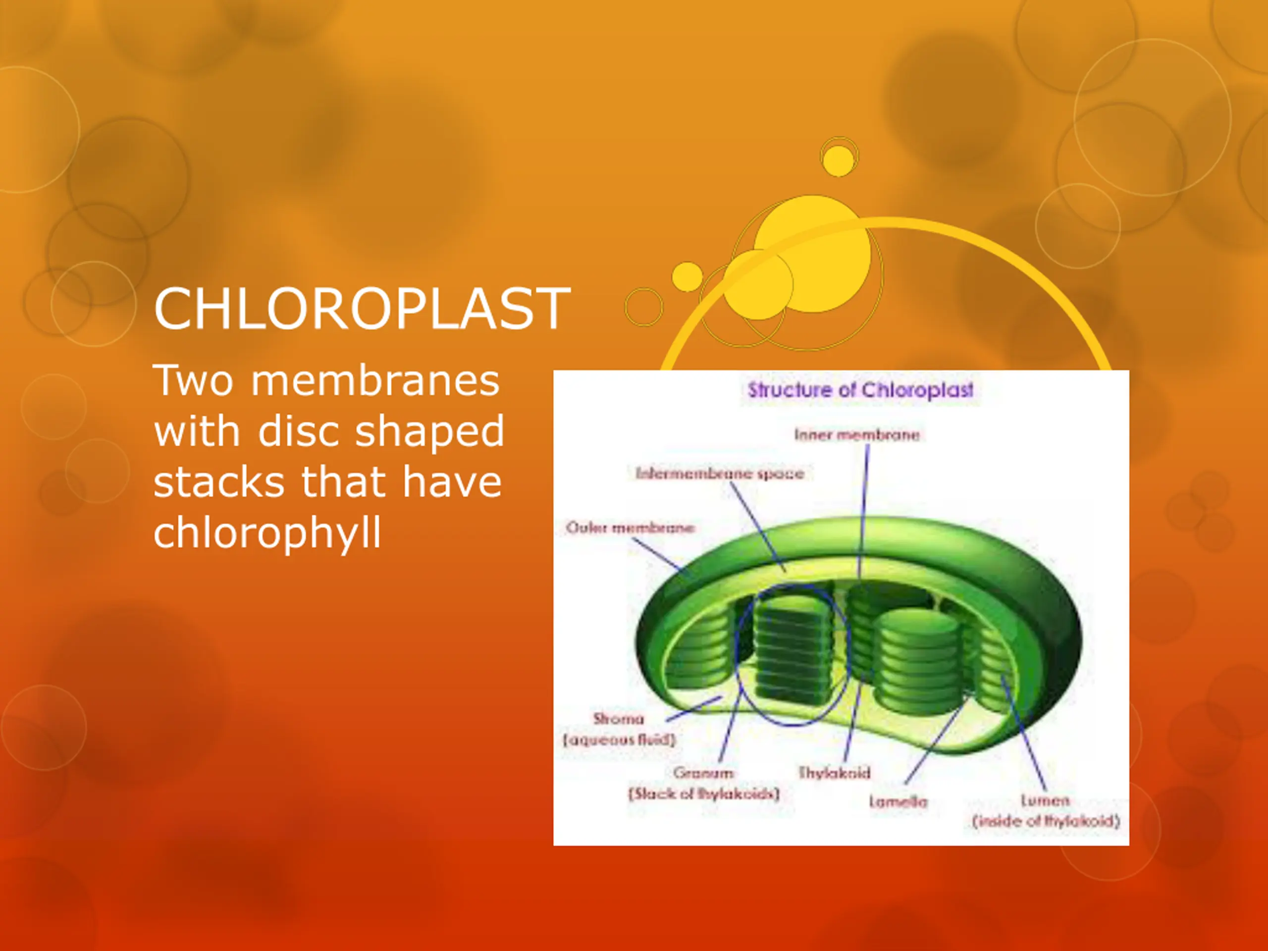 CHLOROPLAST Two membranes with disc shaped stacks that have chlorophyll