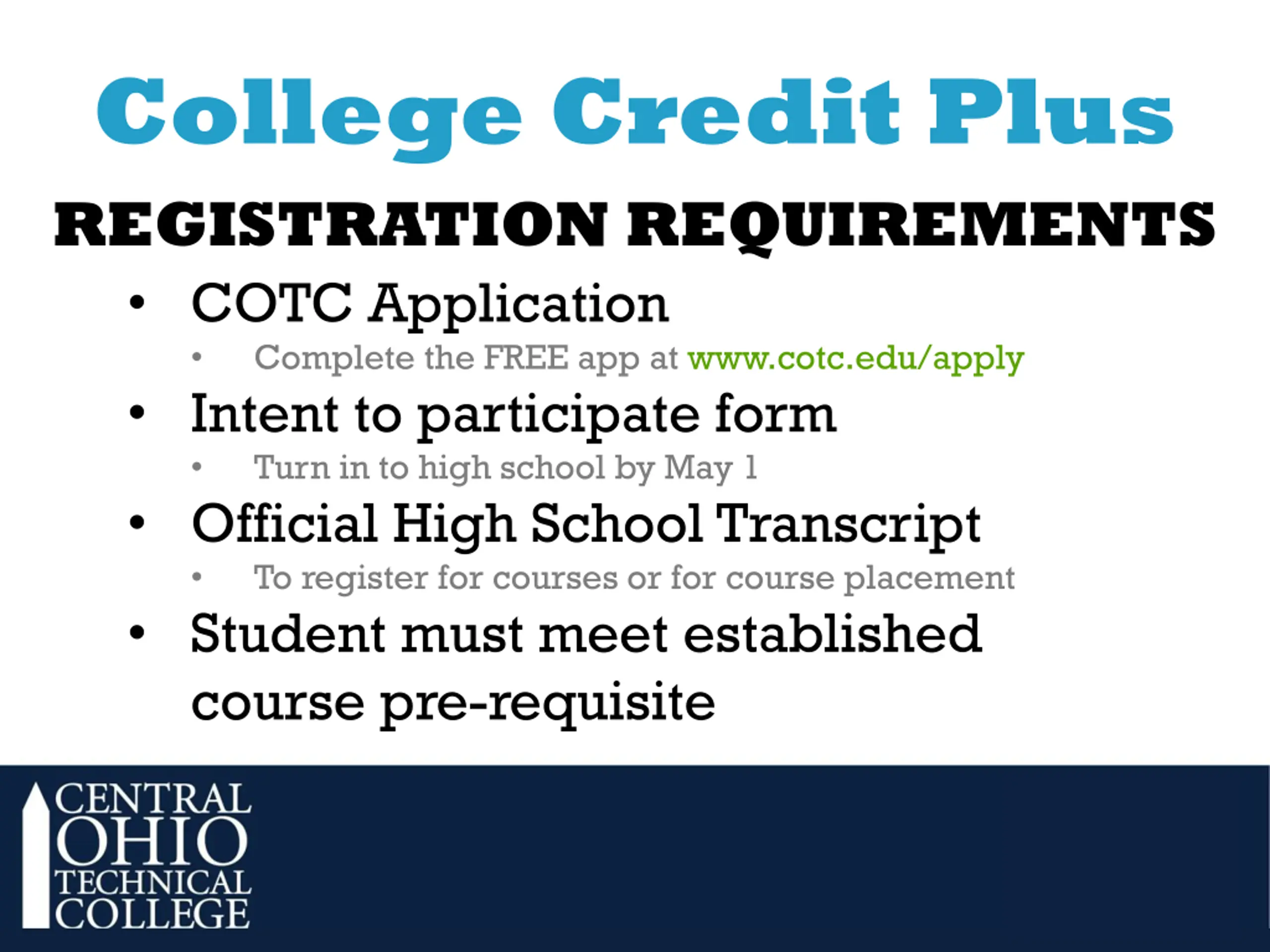 College Credit Plus College Credit Plus REGISTRATION REQUIREMENTS COTC Application Complete the FREE app at www.cotc.edu/apply Intent to participate form Turn in to high school by May 1 Official High School Transcript To register for courses or for course placement Student must meet established course pre-requisite