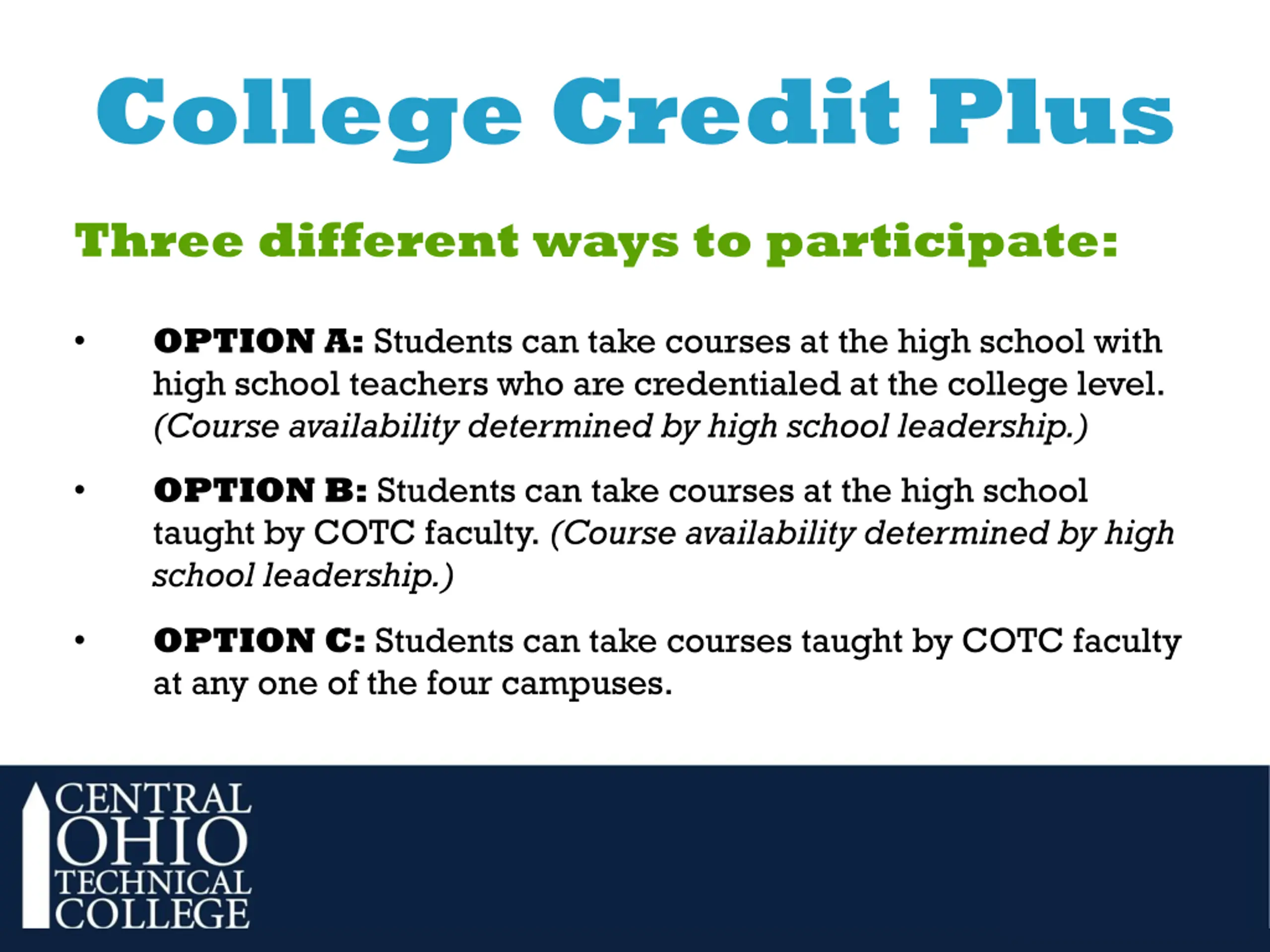 College Credit Plus College Credit Plus Three different ways to participate: OPTION A: Students can take courses at the high school with high school teachers who are credentialed at the college level. (Course availability determined by high school leadership.) OPTION B: Students can take courses at the high school taught by COTC faculty. (Course availability determined by high school leadership.) OPTION C: Students can take courses taught by COTC faculty at any one of the four campuses.