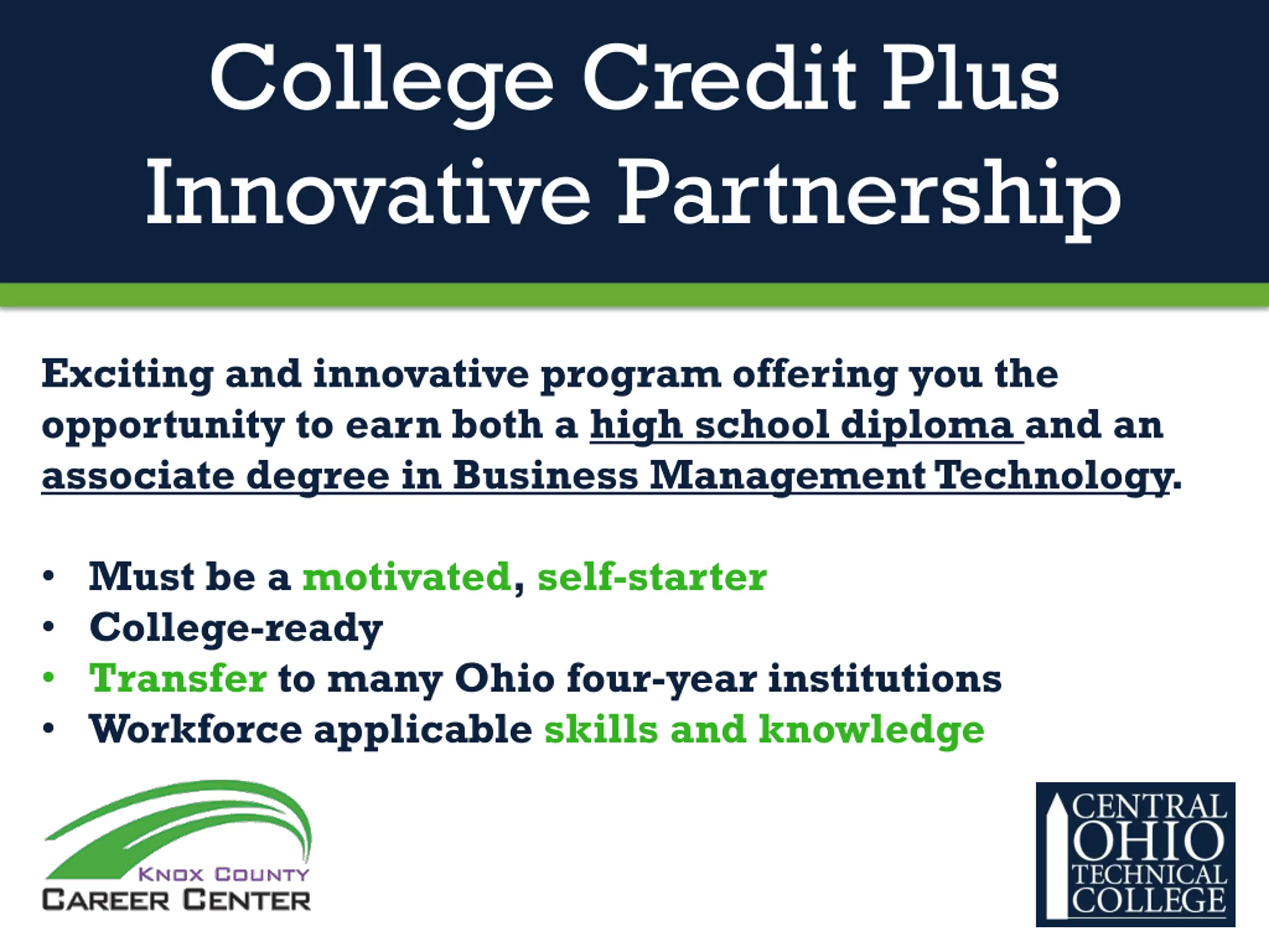 College Credit Plus Innovative Partnership Exciting and innovative program offering you the opportunity to earn both a high school diploma and an associate degree in Business Management Technology. Must be a motivated, self-starter College-ready Transfer to many Ohio four-year institutions Workforce applicable skills and knowledge