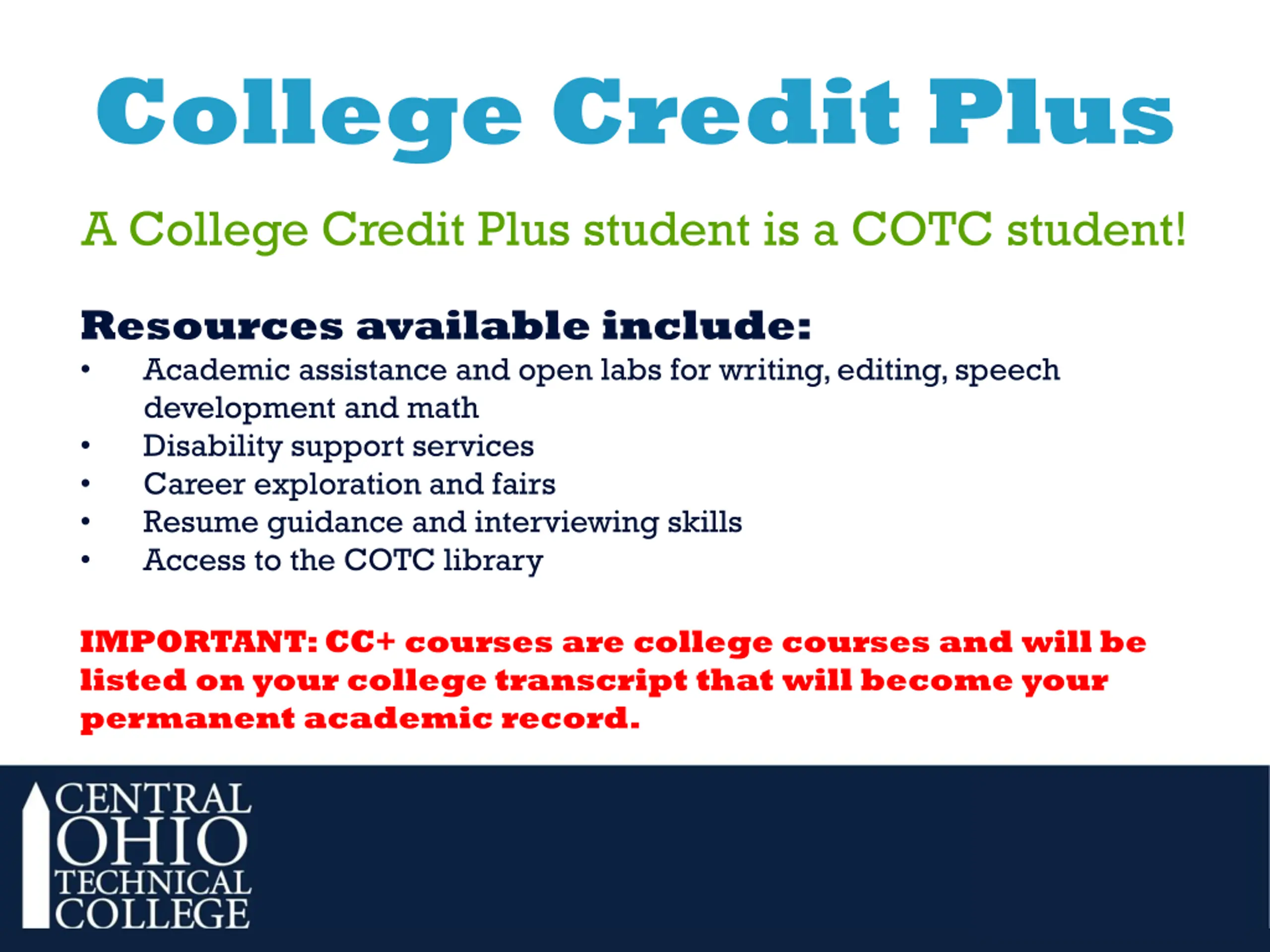 College Credit Plus A College Credit Plus student is a COTC student! Resources available include: Academic assistance and open labs for writing, editing, speech development and math Disability support services Career exploration and fairs Resume guidance and interviewing skills Access to the COTC library IMPORTANT: CC+ courses are college courses and will be listed on your college transcript that will become your permanent academic record.