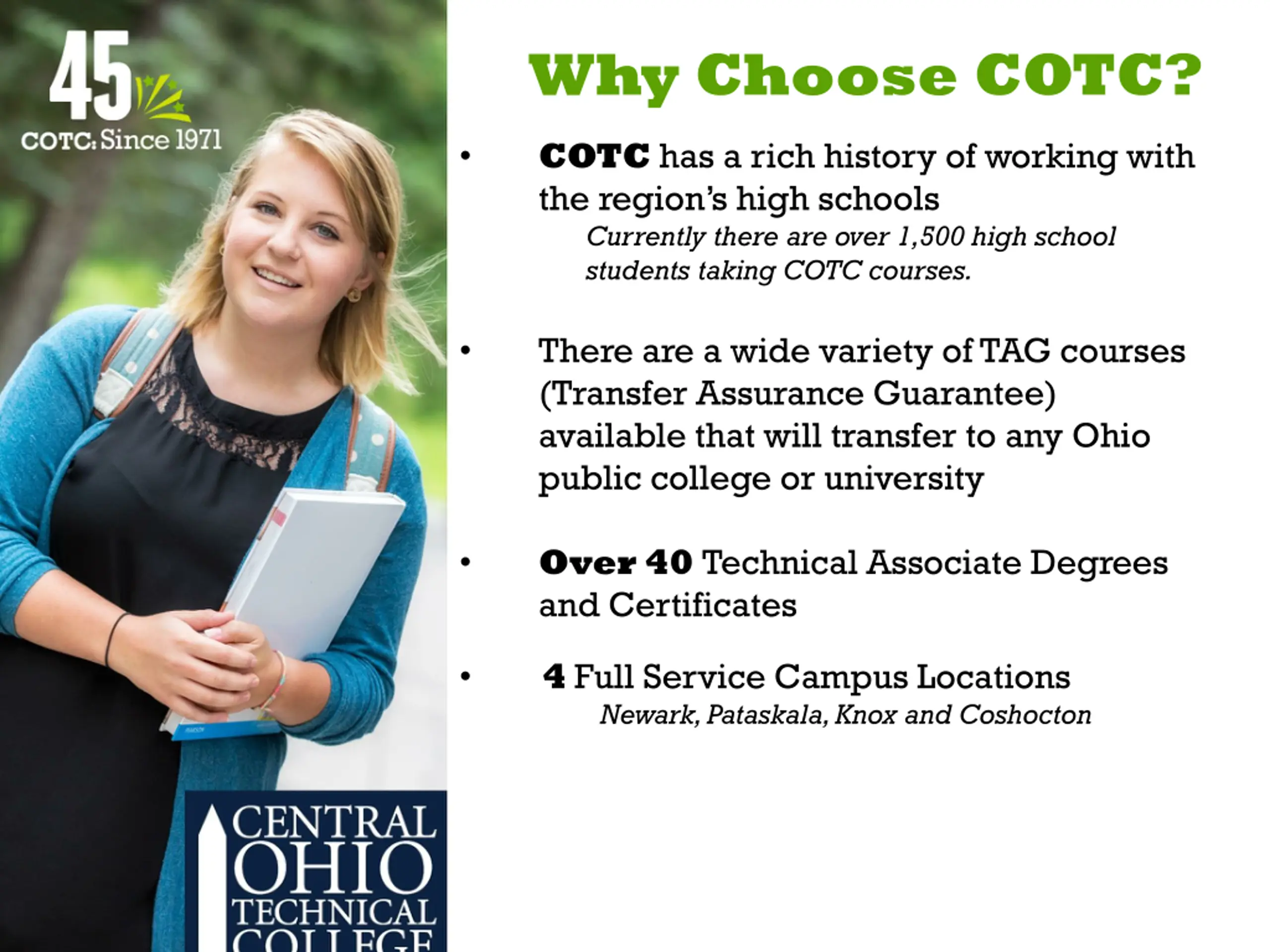 Why Choose COTC? COTC has a rich history of working with the region s high schools Currently there are over 1,500 high school students taking COTC courses. There are a wide variety of TAG courses (Transfer Assurance Guarantee) available that will transfer to any Ohio public college or university Over 40 Technical Associate Degrees and Certificates 4Full Service Campus Locations Newark, Pataskala, Knox and Coshocton