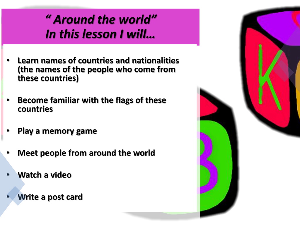 Around the world In this lesson I will Learn names of countries and nationalities (the names of the people who come from these countries) Become familiar with the flags of these countries Play a memory game Meet people from around the world Watch a video Write a post card