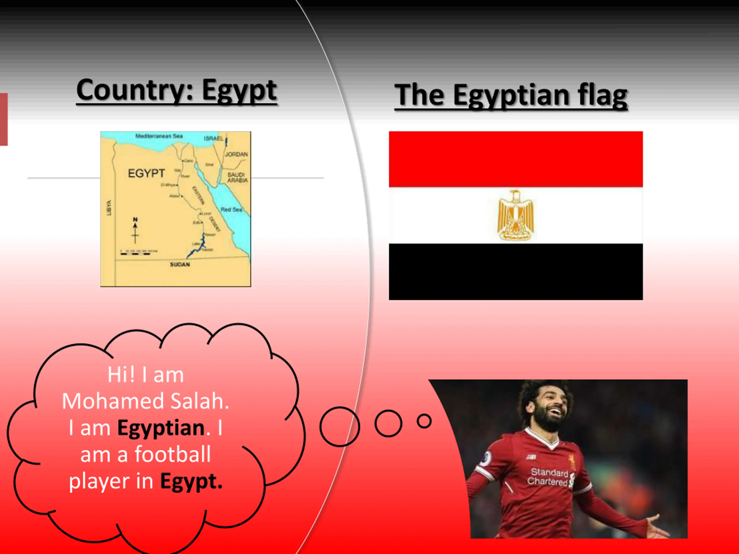 Country: Egypt The Egyptian flag Hi! I am Mohamed Salah. I am Egyptian. I am a football player in Egypt.