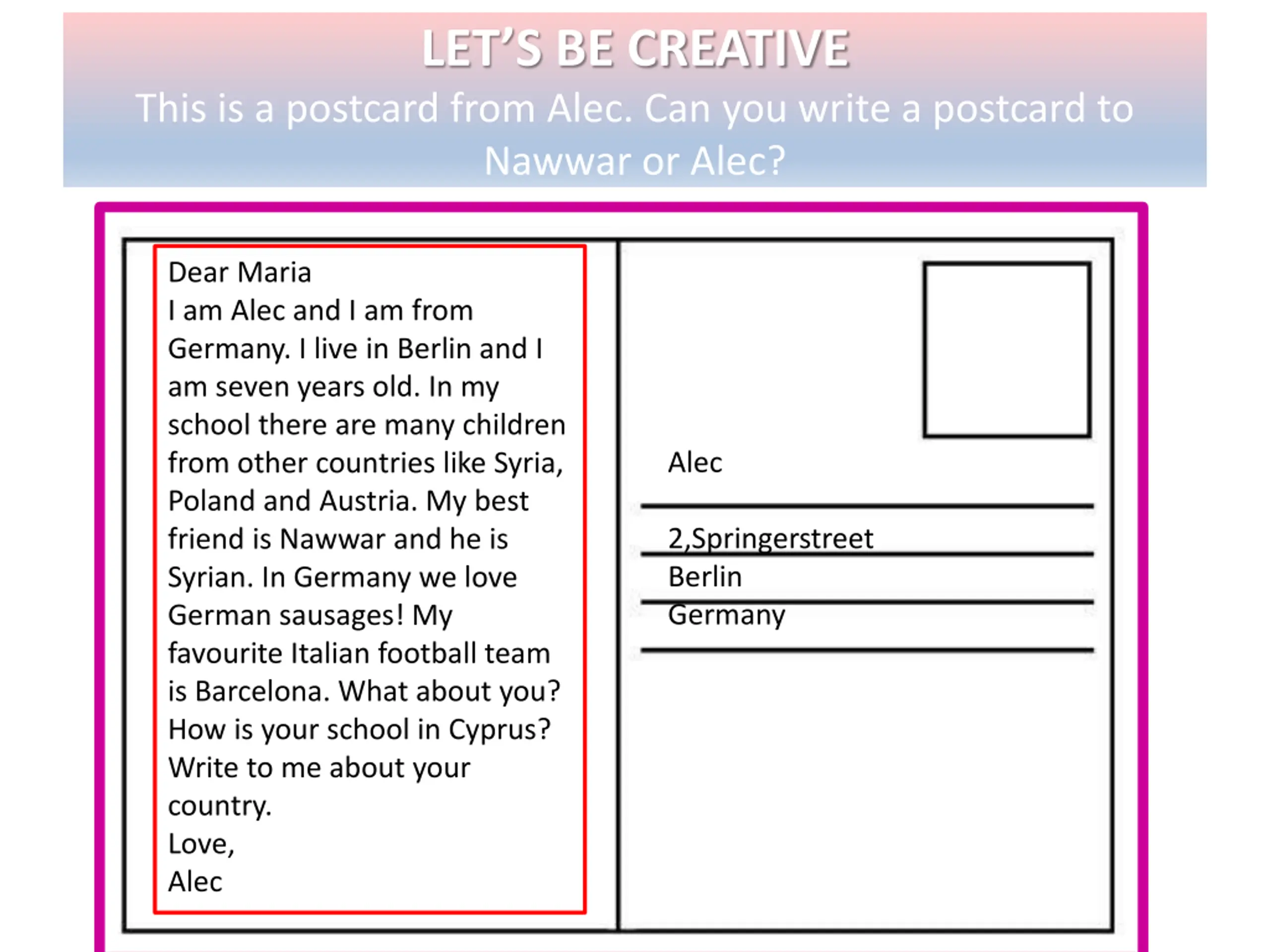 LETS BE CREATIVE This is a postcard from Alec. Can you write a postcard to Nawwar or Alec? Dear Maria I am Alec and I am from Germany. I live in Berlin and I am seven years old. In my school there are many children from other countries like Syria, Poland and Austria. My best friend is Nawwar and he is Syrian. In Germany we love German sausages! My favourite Italian football team is Barcelona. What about you? How is your school in Cyprus? Write to me about your country. Love, Alec Alec 2,Springerstreet Berlin Germany