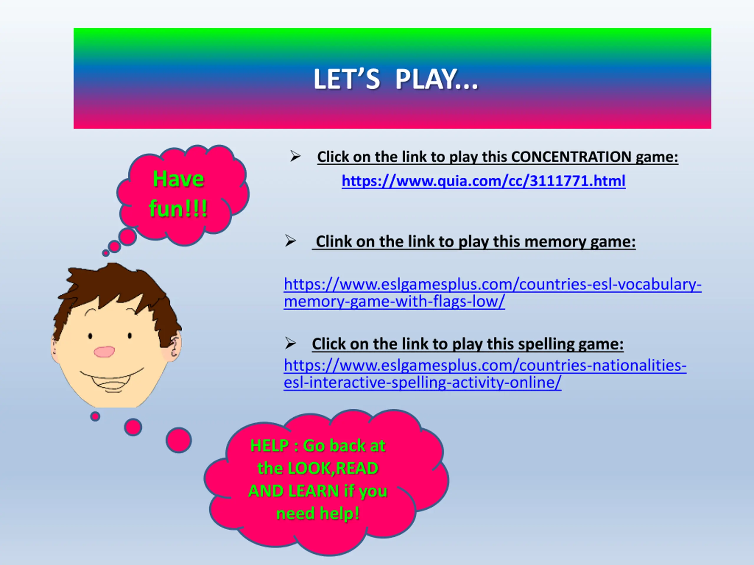 LETS PLAY... Click on the link to play this CONCENTRATION game: https://www.quia.com/cc/3111771.html Have fun!!! Clink on the link to play this memory game: https://www.eslgamesplus.com/countries-esl-vocabulary- memory-game-with-flags-low/ Click on the link to play this spelling game: https://www.eslgamesplus.com/countries-nationalities- esl-interactive-spelling-activity-online/ HELP : Go back at the LOOK,READ AND LEARN if you need help!
