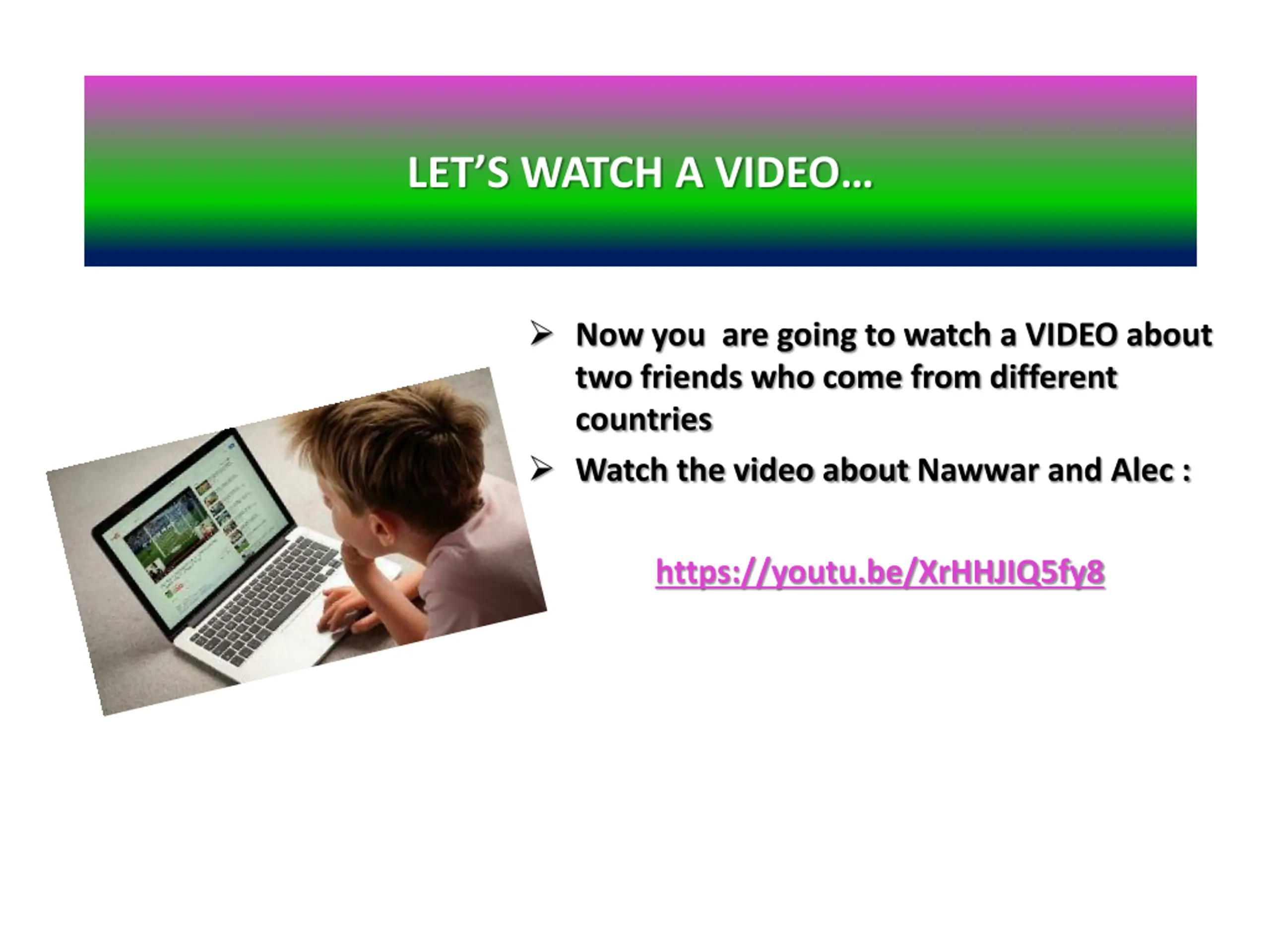 LETS WATCH A VIDEO Now you are going to watch a VIDEO about two friends who come from different countries Watch the video about Nawwar and Alec : https://youtu.be/XrHHJIQ5fy8