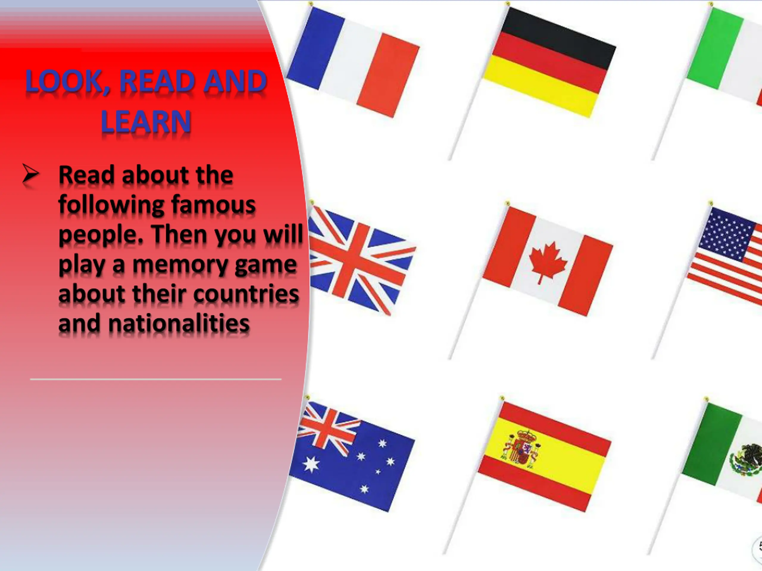 LOOK, READ AND LEARN Read about the following famous people. Then you will play a memory game about their countries and nationalities