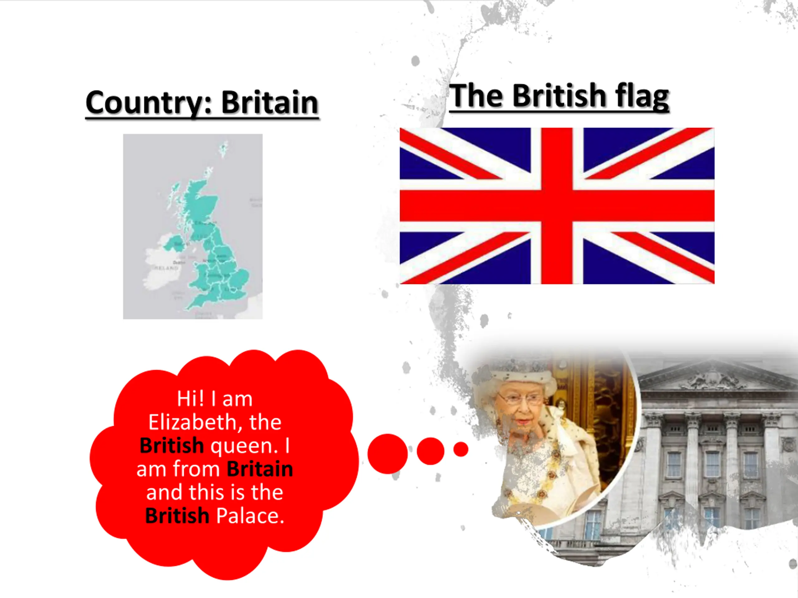 The British flag Country: Britain Hi! I am Elizabeth, the British queen. I am from Britain and this is the British Palace.