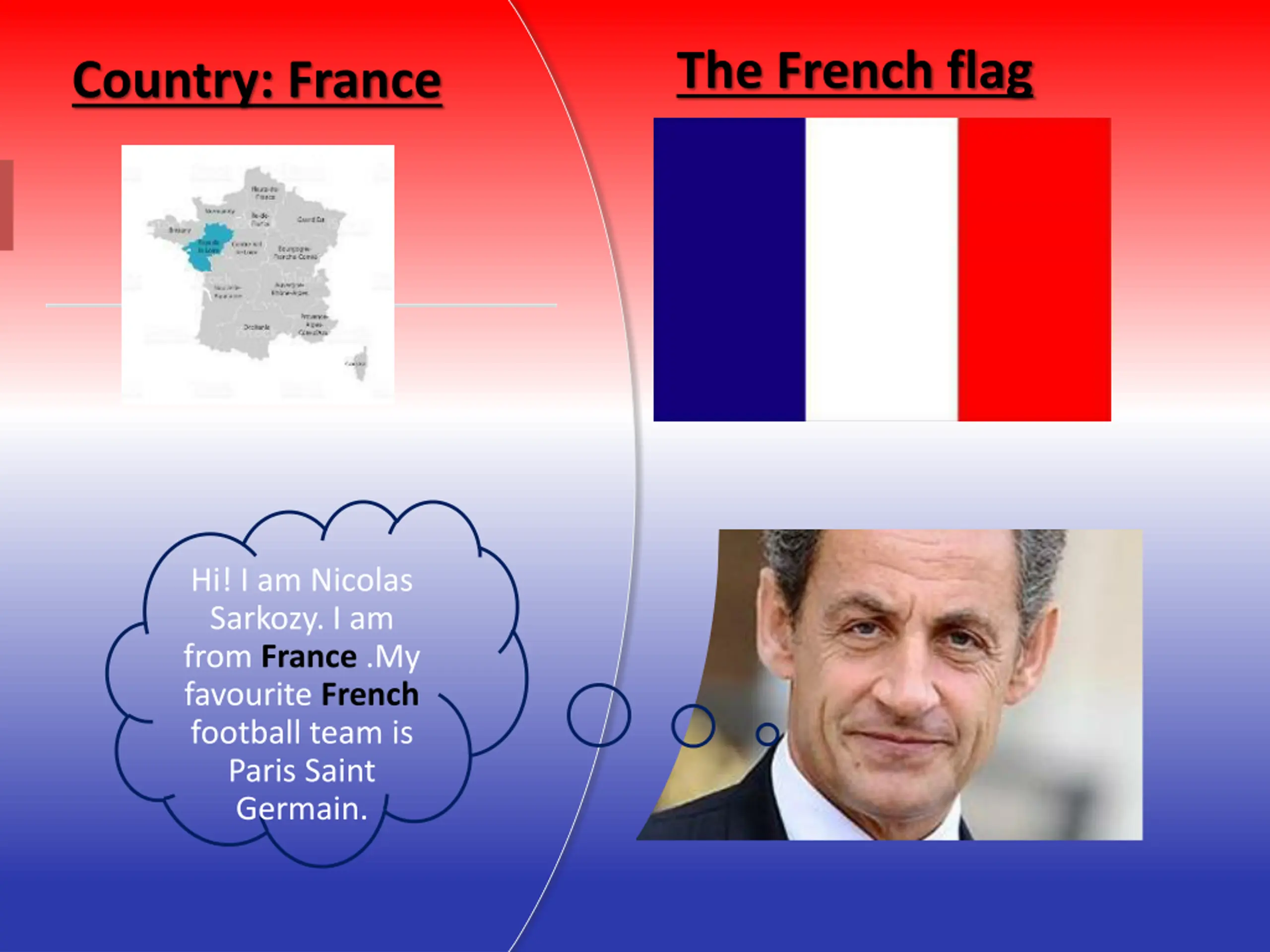 The French flag Country: France Hi! I am Nicolas Sarkozy. I am from France .My favourite French football team is Paris Saint Germain.