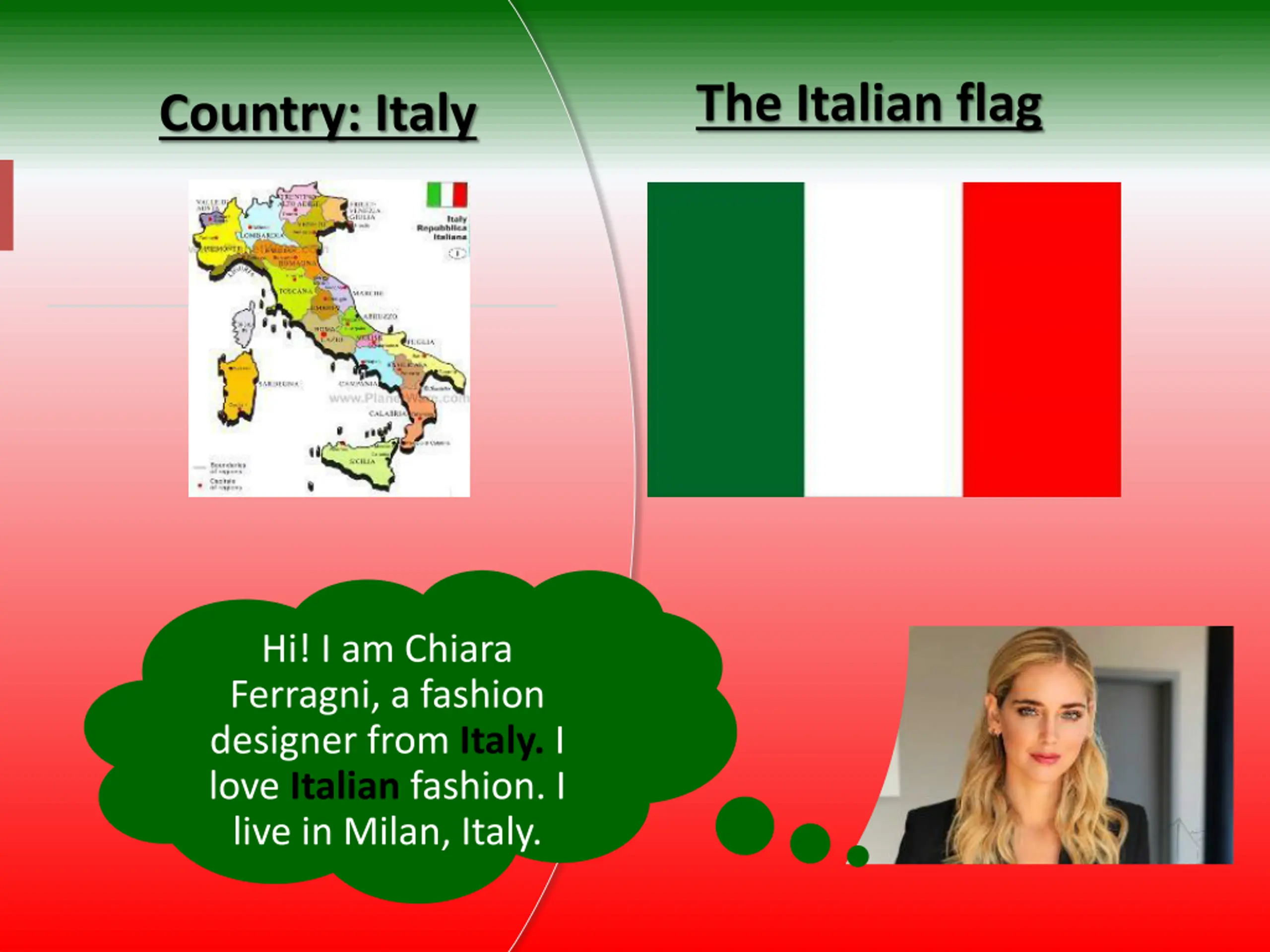 The Italian flag Country: Italy Hi! I am Chiara Ferragni, a fashion designer from Italy. I love Italian fashion. I live in Milan, Italy.
