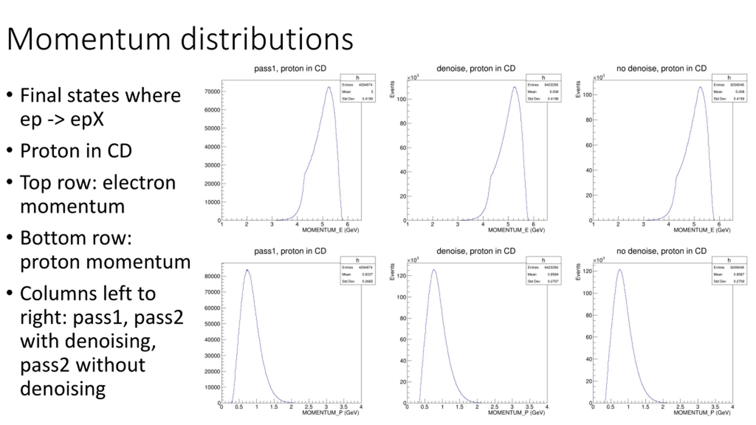 Momentum distributions Final states where ep -> epX Proton in CD Top row: electron momentum Bottom row: proton momentum Columns left to right: pass1, pass2 with denoising, pass2 without denoising