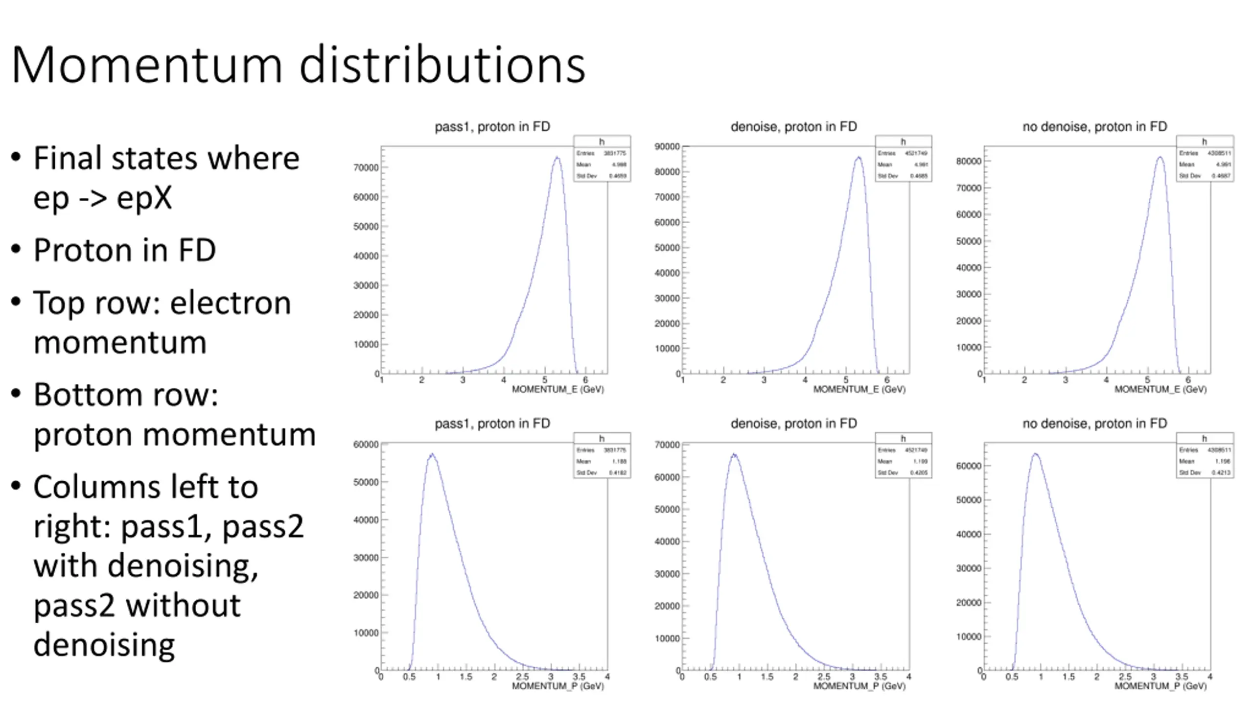 Momentum distributions Final states where ep -> epX Proton in FD Top row: electron momentum Bottom row: proton momentum Columns left to right: pass1, pass2 with denoising, pass2 without denoising