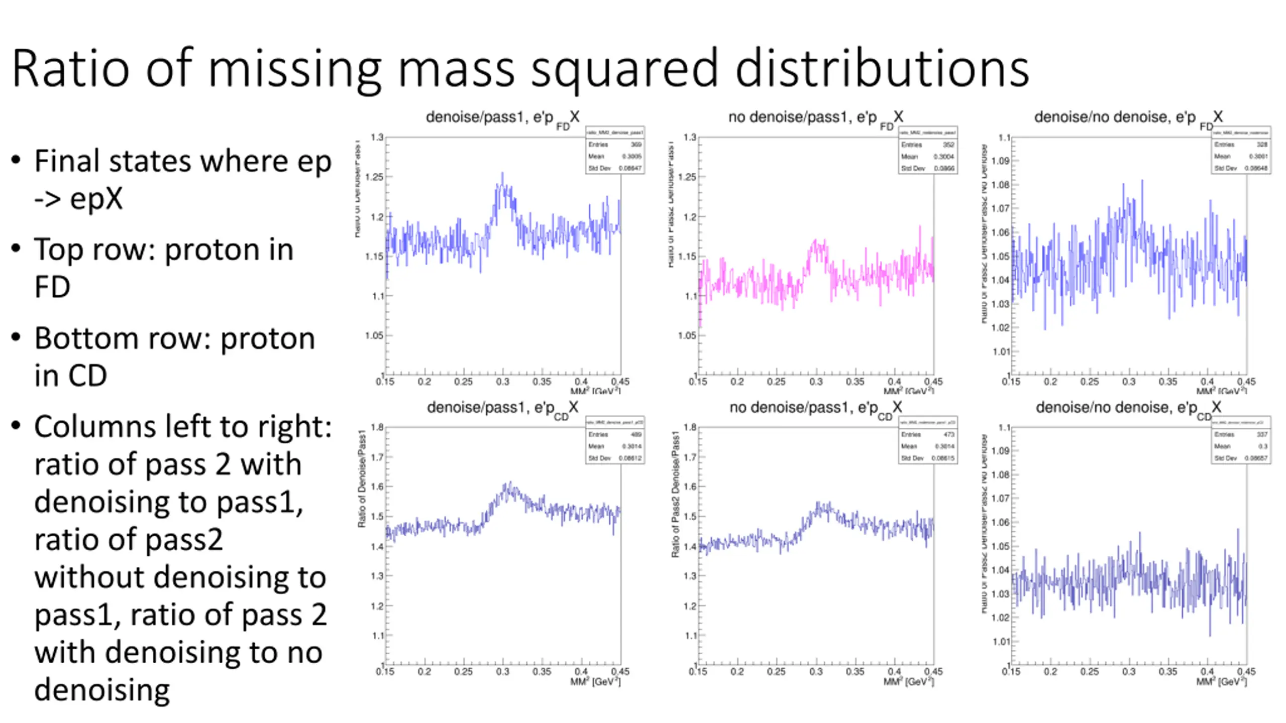 Ratio of missing mass squared distributions Final states where ep -> epX Top row: proton in FD Bottom row: proton in CD Columns left to right: ratio of pass 2 with denoising to pass1, ratio of pass2 without denoising to pass1, ratio of pass 2 with denoising to no denoising