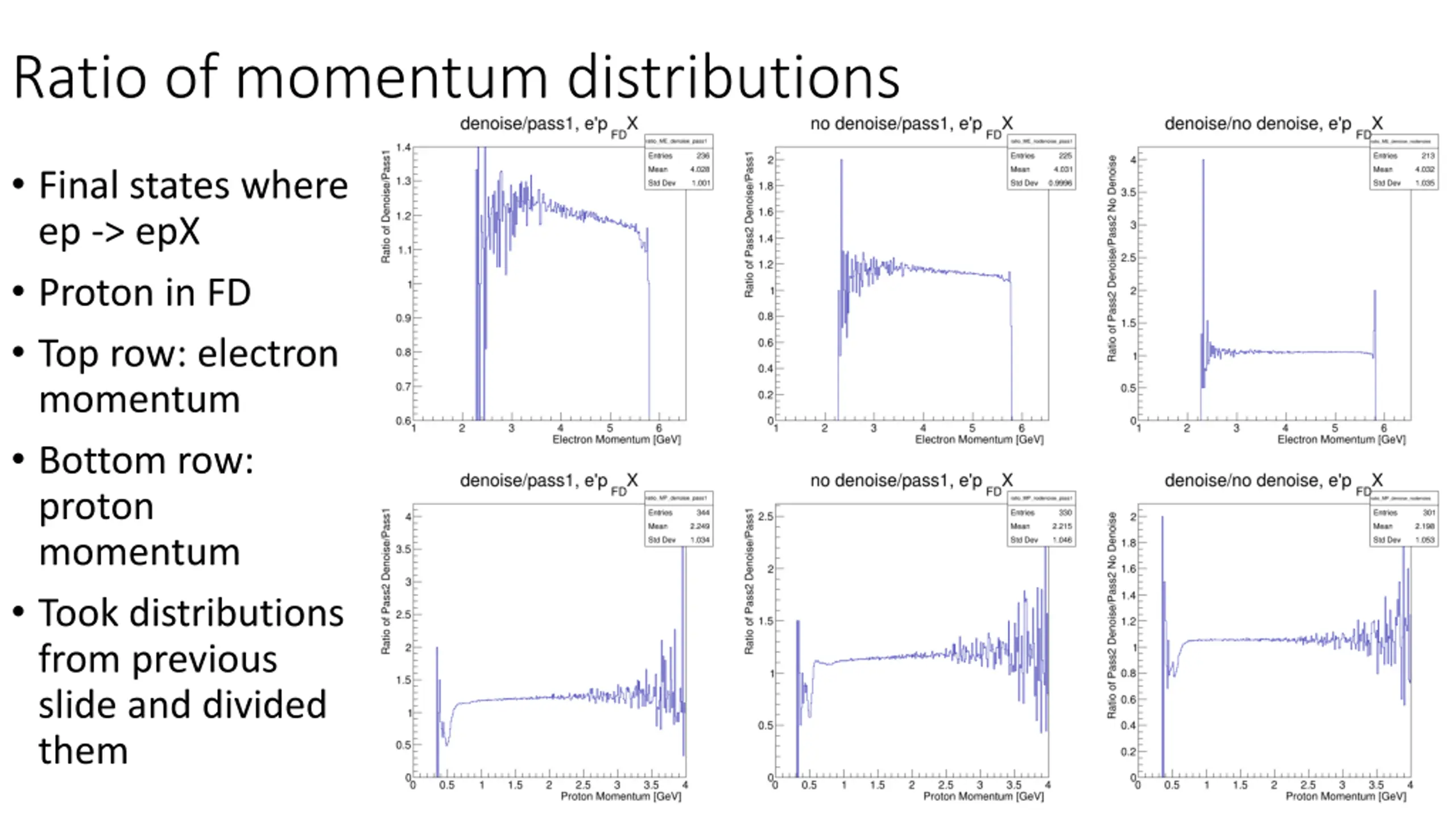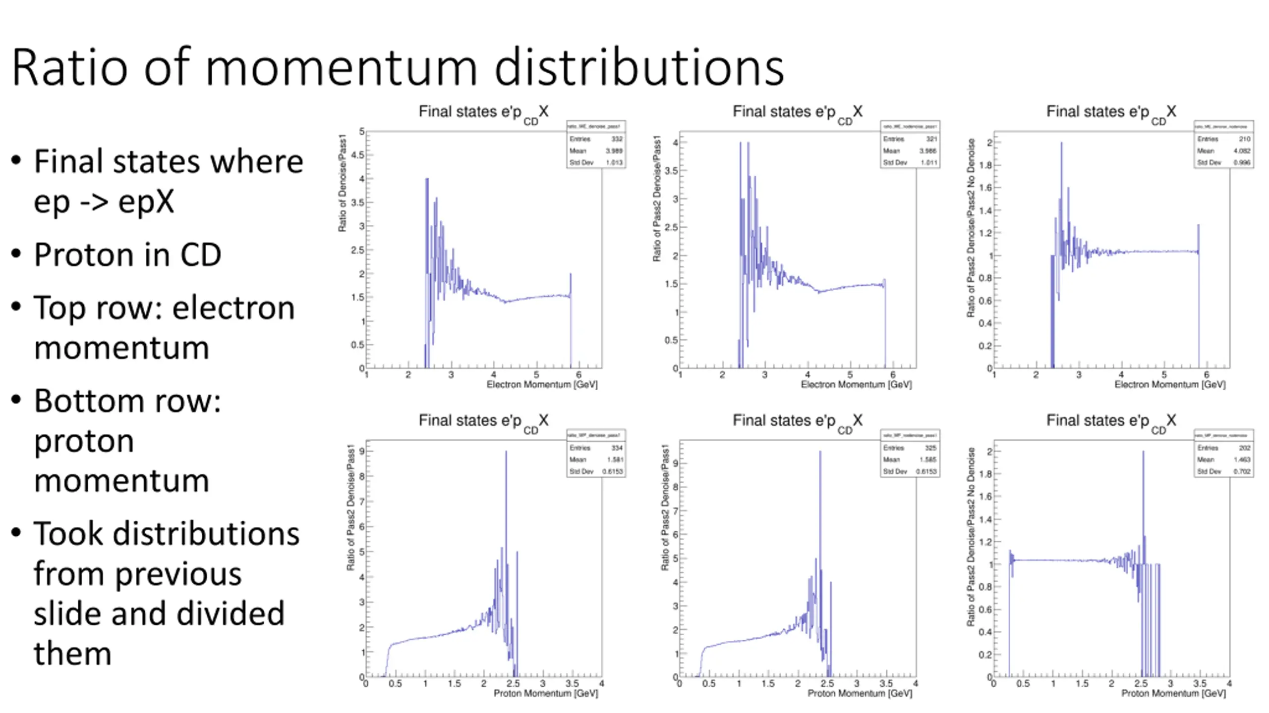 Ratio of momentum distributions Final states where ep -> epX Proton in CD Top row: electron momentum Bottom row: proton momentum Took distributions from previous slide and divided them