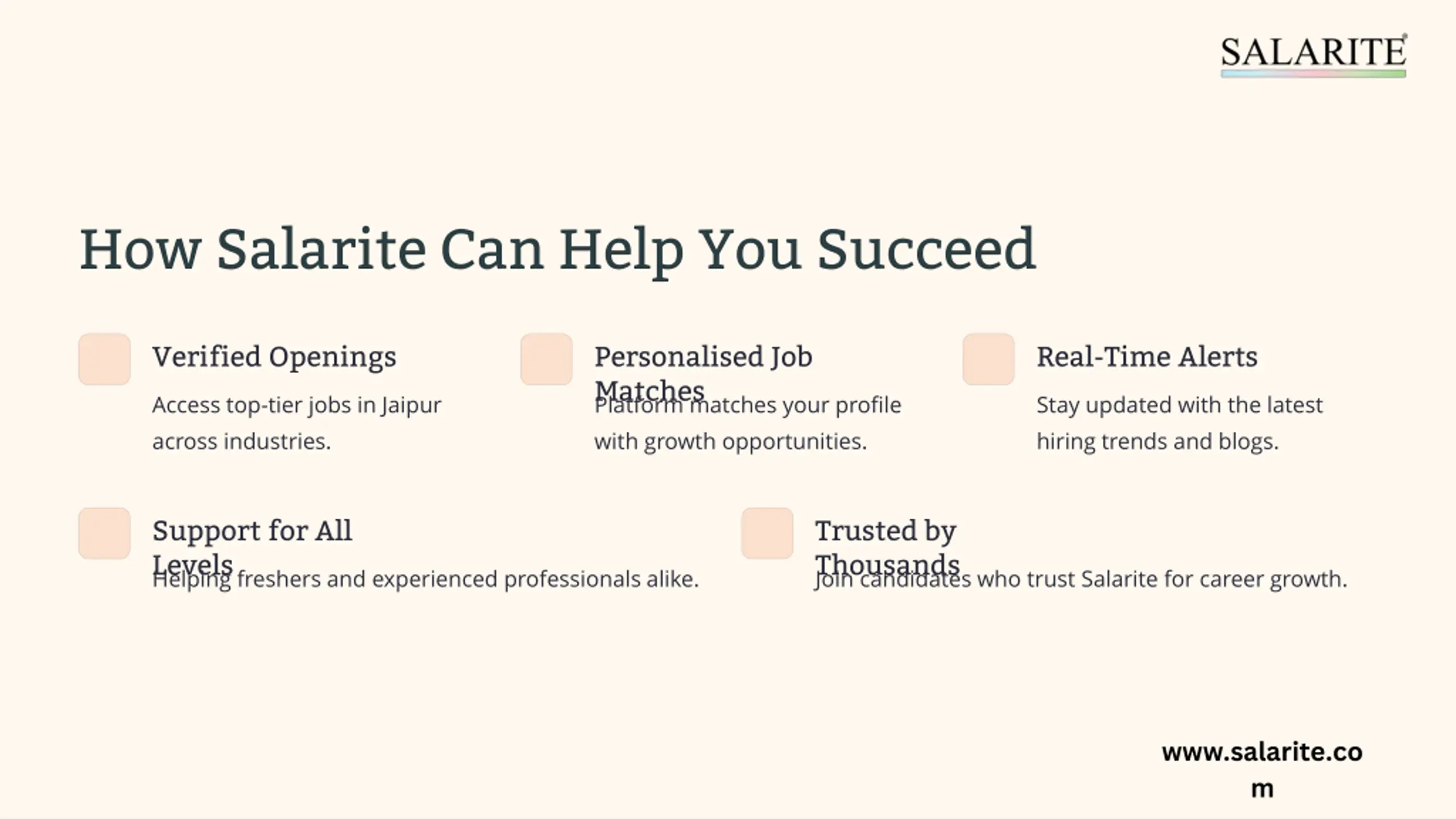 How Salarite Can Help You Succeed Verified Openings Personalised Job Matches Platform matches your profile with growth opportunities. Real-Time Alerts Access top-tier jobs in Jaipur across industries. Stay updated with the latest hiring trends and blogs. Support for All Levels Helping freshers and experienced professionals alike. Trusted by Thousands Join candidates who trust Salarite for career growth. www.salarite.co m
