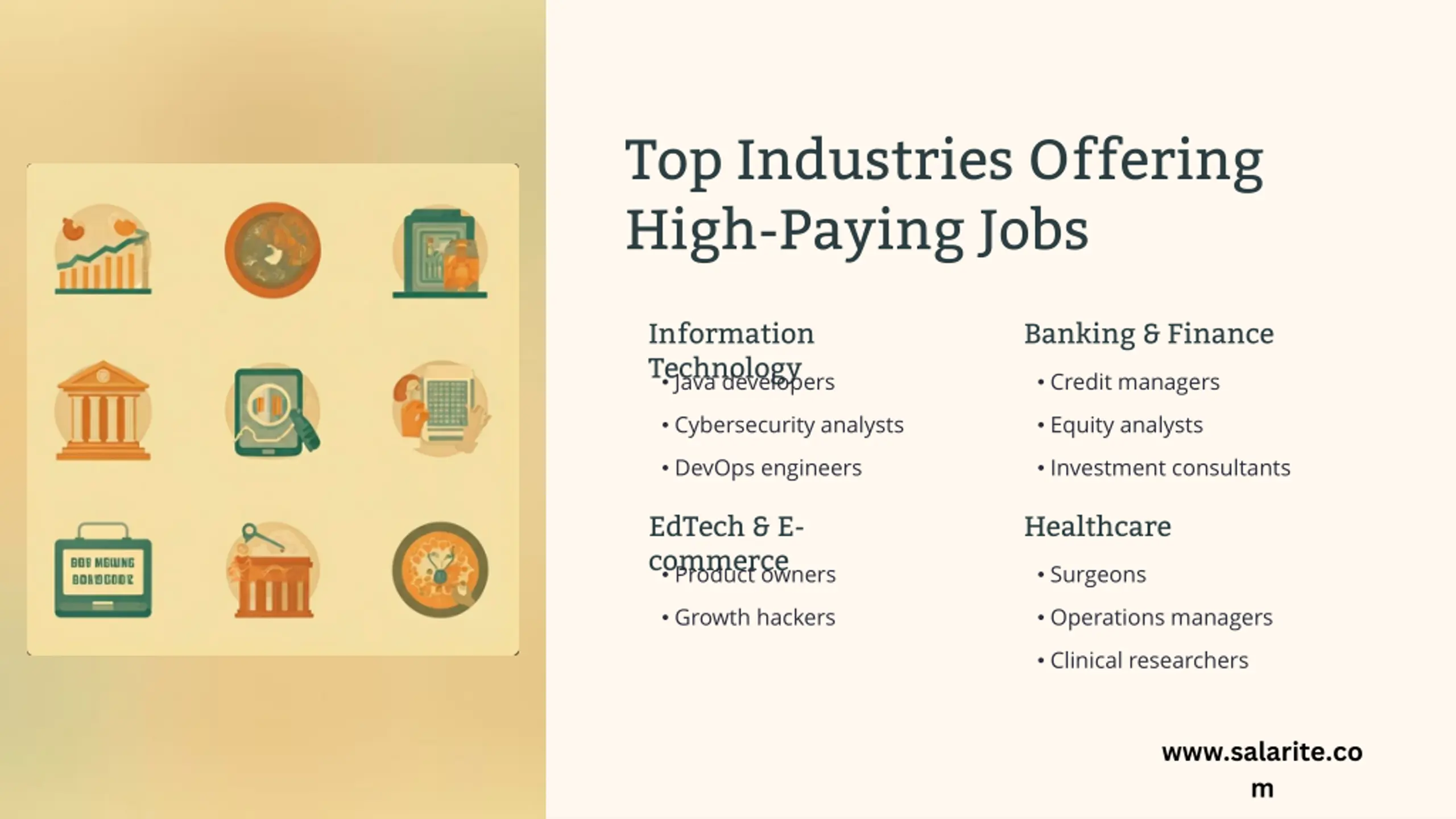 Top Industries Offering High-Paying Jobs Information Technology Java developers Banking & Finance Credit managers Cybersecurity analysts Equity analysts DevOps engineers Investment consultants EdTech & E- commerce Product owners Healthcare Surgeons Growth hackers Operations managers Clinical researchers www.salarite.co m