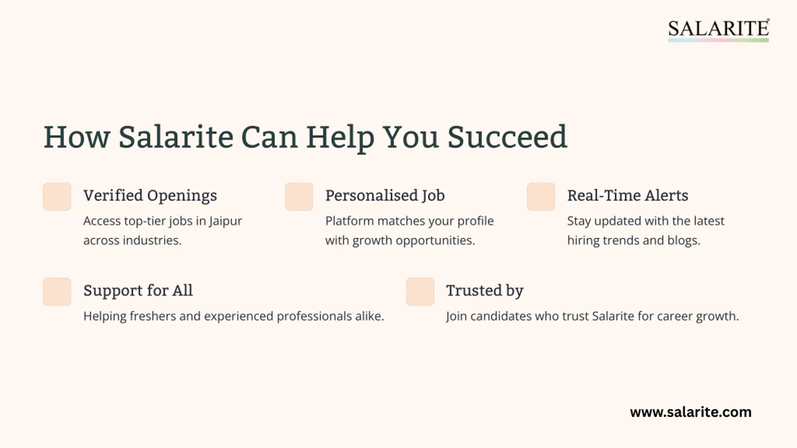 How Salarite Can Help You Succeed Verified Openings Personalised Job Real-Time Alerts Access top-tier jobs in Jaipur across industries. Platform matches your profile with growth opportunities. Stay updated with the latest hiring trends and blogs. Support for All Trusted by Helping freshers and experienced professionals alike. Join candidates who trust Salarite for career growth. www.salarite.com
