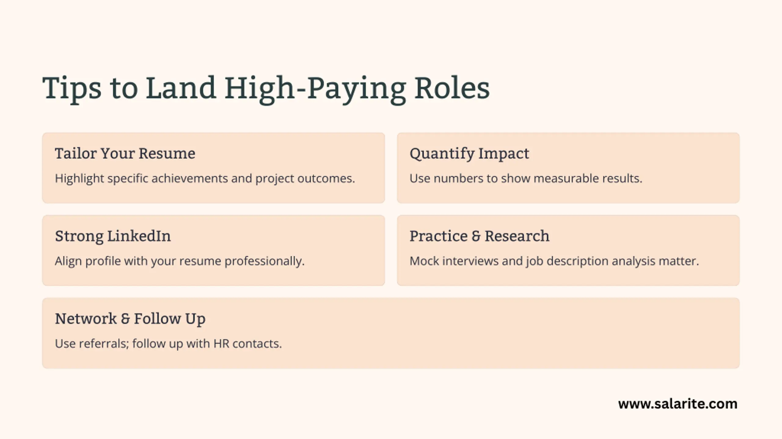 Tips to Land High-Paying Roles Tailor Your Resume Quantify Impact Highlight specific achievements and project outcomes. Use numbers to show measurable results. Strong LinkedIn Practice & Research Align profile with your resume professionally. Mock interviews and job description analysis matter. Network & Follow Up Use referrals; follow up with HR contacts. www.salarite.com