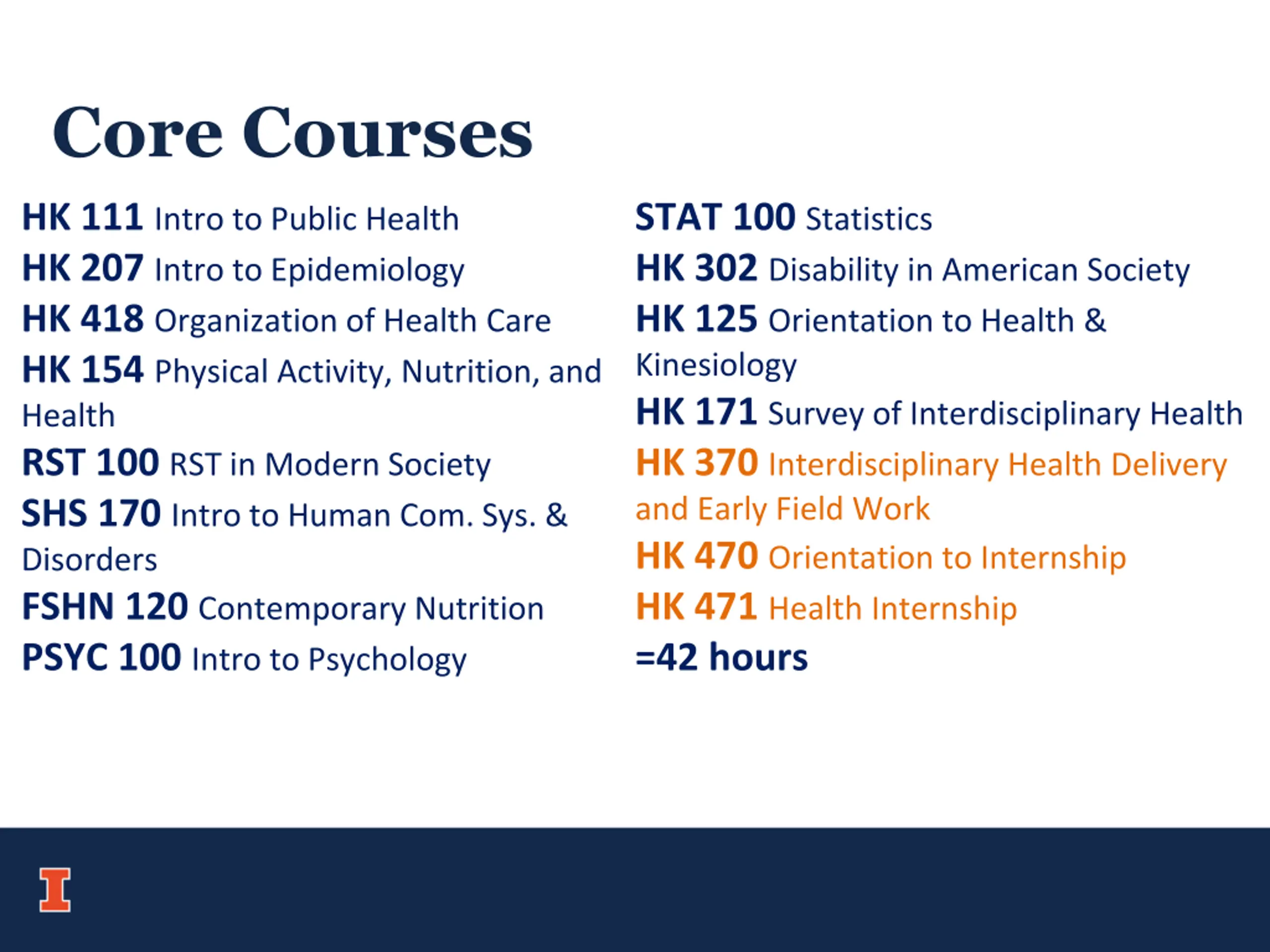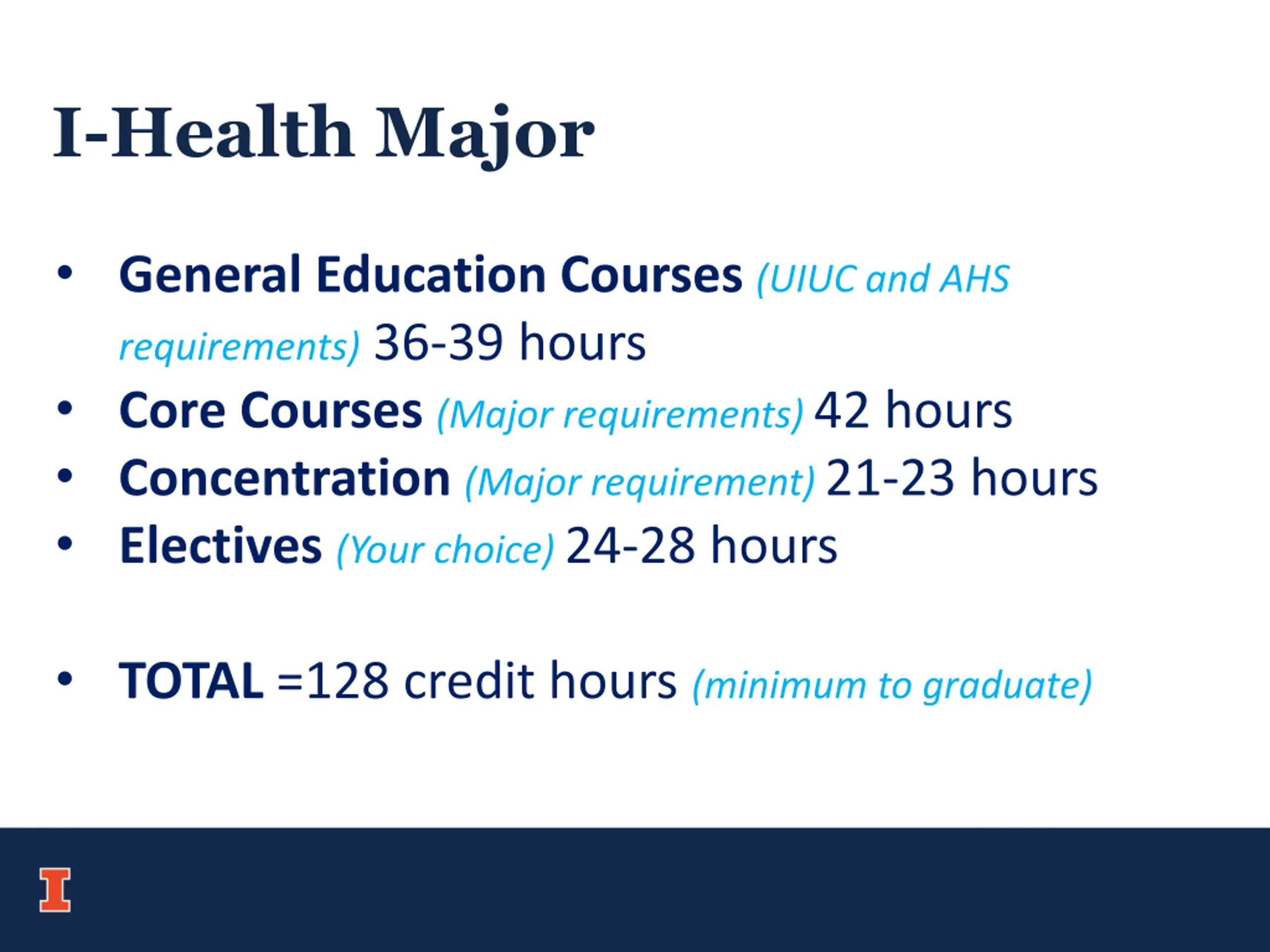 I-Health Major General Education Courses (UIUC and AHS requirements) 36-39 hours Core Courses (Major requirements)42 hours Concentration(Major requirement) 21-23 hours Electives(Your choice) 24-28 hours Includes full-semester internship in health agency! TOTAL =128 credit hours (minimum to graduate)