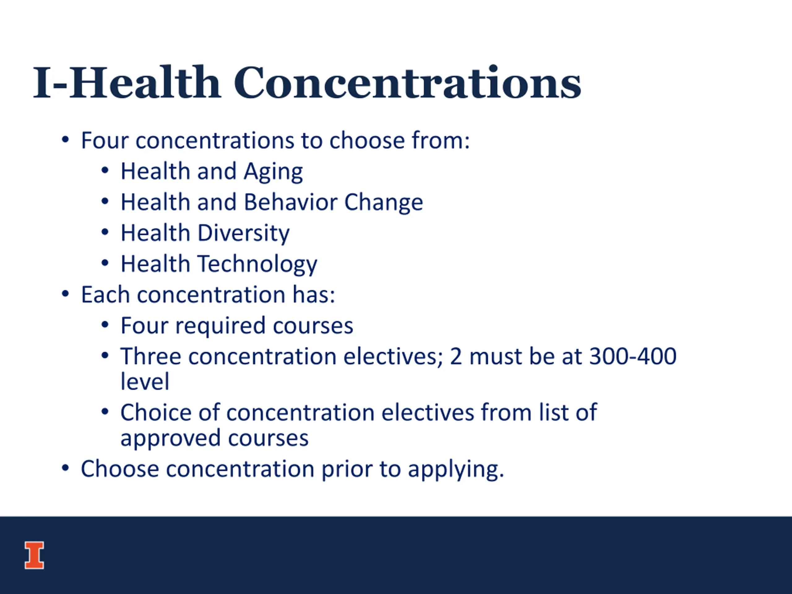 I-Health Concentrations Four concentrations to choose from: Health and Aging Health and Behavior Change Health Diversity Health Technology Each concentration has: Four required courses Three concentration electives; 2 must be at 300-400 level Choice of concentration electives from list of approved courses Choose concentration prior to applying.