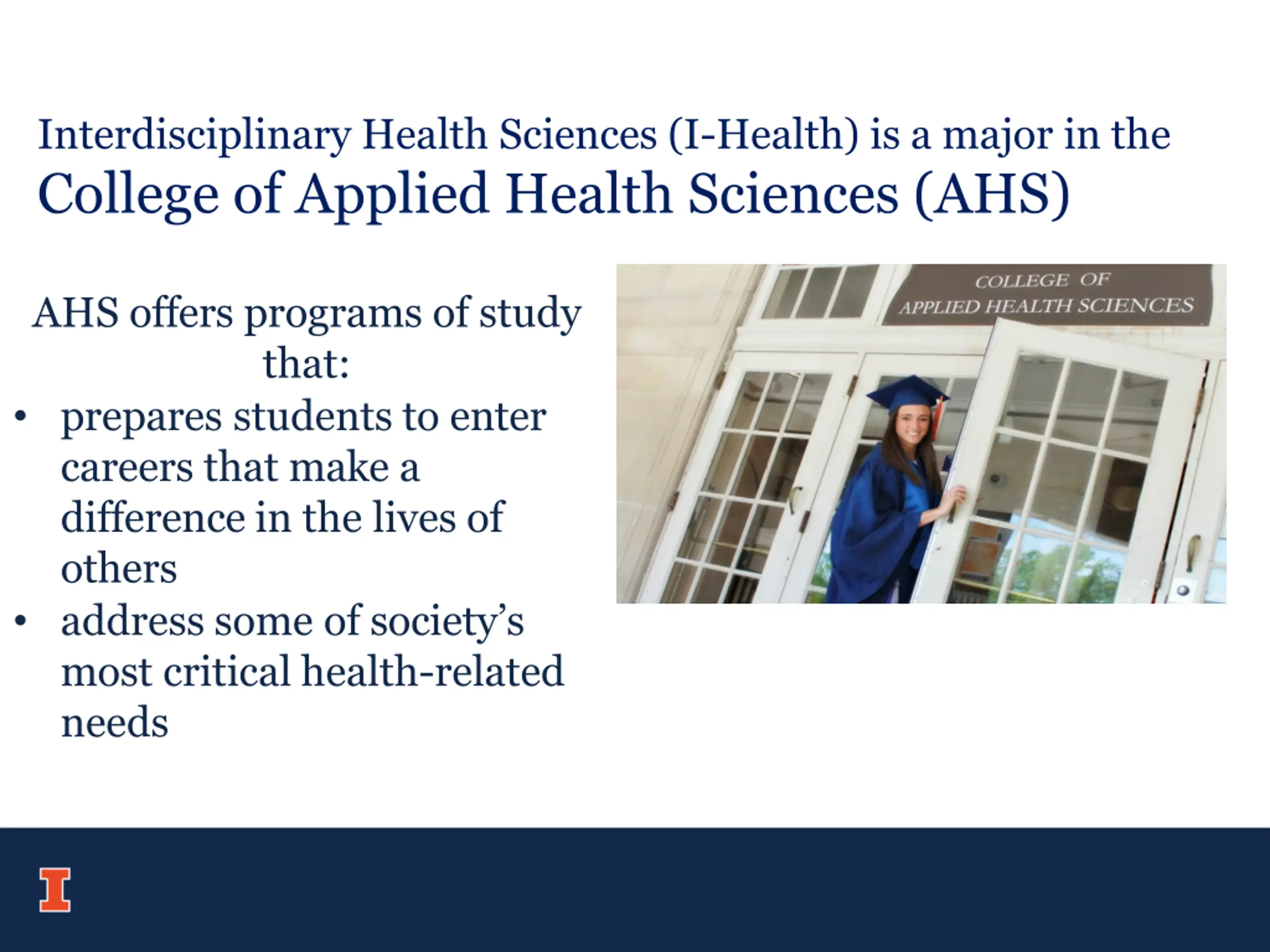 Interdisciplinary Health Sciences (I-Health) is a major in the College of Applied Health Sciences (AHS) AHS offers programs of study that: prepares students to enter careers that make a difference in the lives of others address some of society s most critical health-related needs