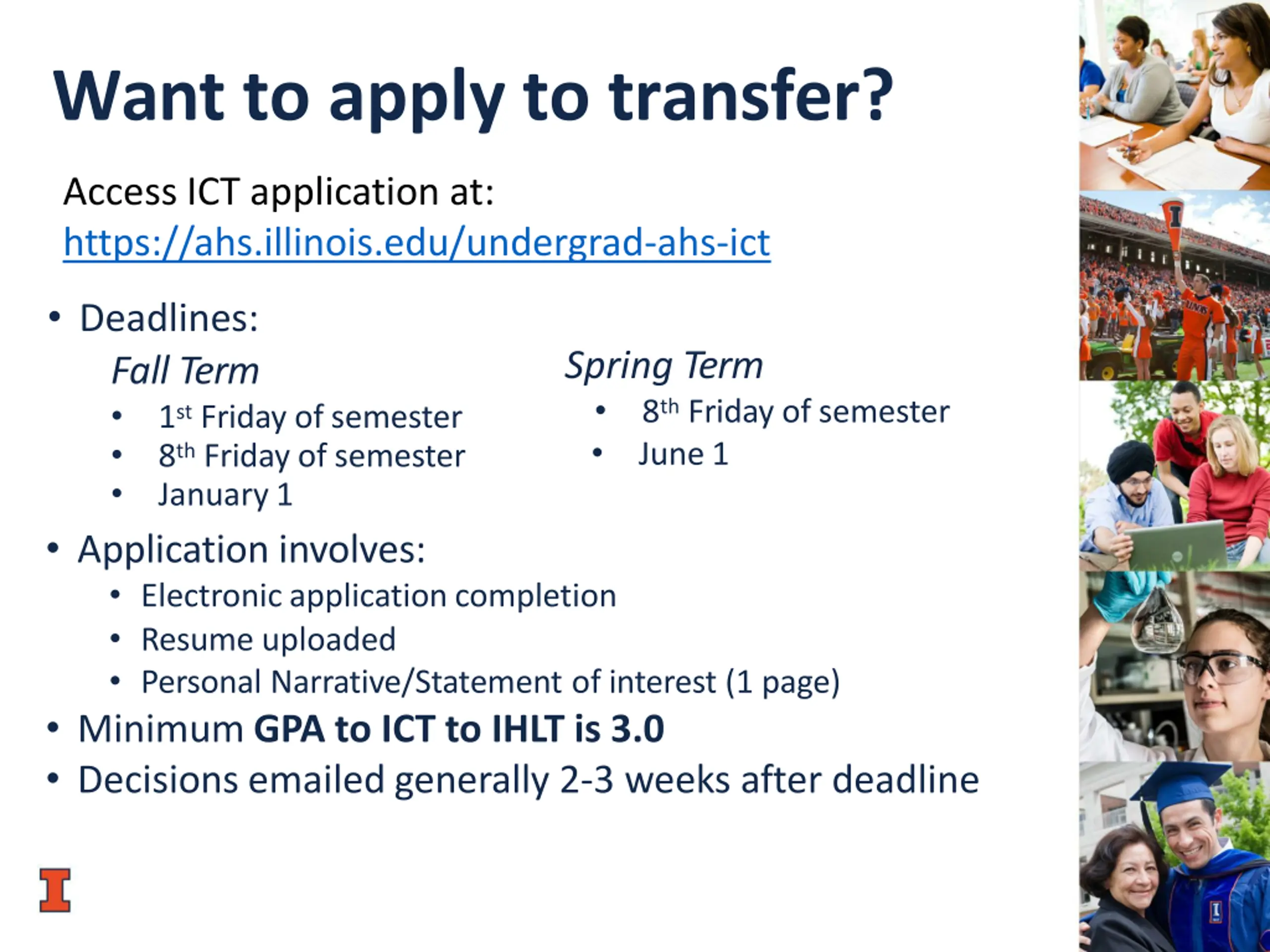 Want to apply to transfer? Access ICT application at: https://ahs.illinois.edu/undergrad-ahs-ict Deadlines: Fall Term Application involves: Electronicapplicationcompletion Resume uploaded Personal Narrative/Statement of interest (1 page) Minimum GPA to ICT to IHLT is 3.0 Decisions emailed generally 2-3 weeks after deadline Spring Term 8thFriday of semester June1 1stFriday of semester 8thFriday of semester January1